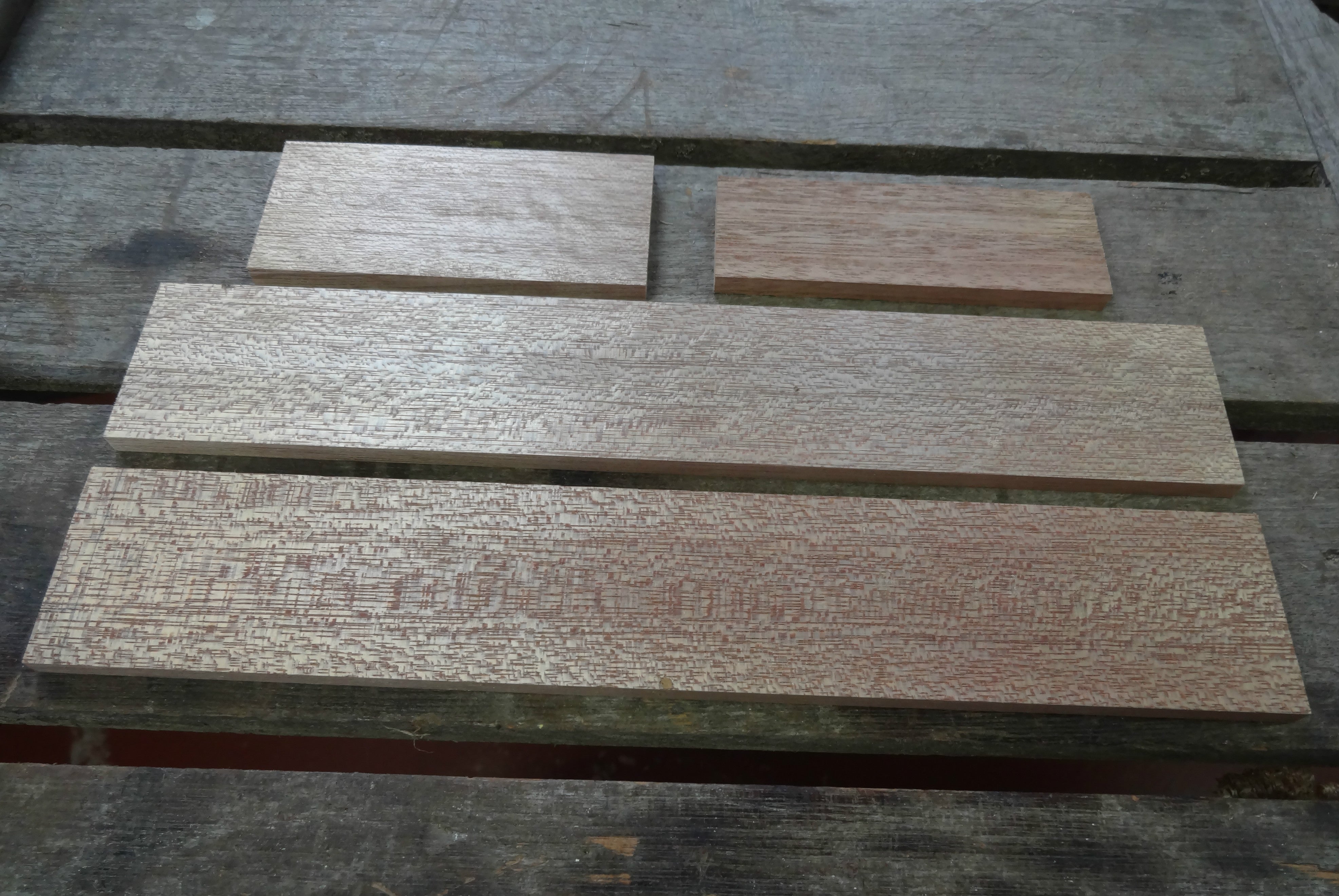 Because we are making a lidded box, one of the short pieces is also narrower than all the others. It's reduced by the width of the groove (see later) + the height of material left above the groove. For example, if your groove is 6 mm, and the material above it is also 6, then one of the short pieces should be 12 mm narrower than the others.