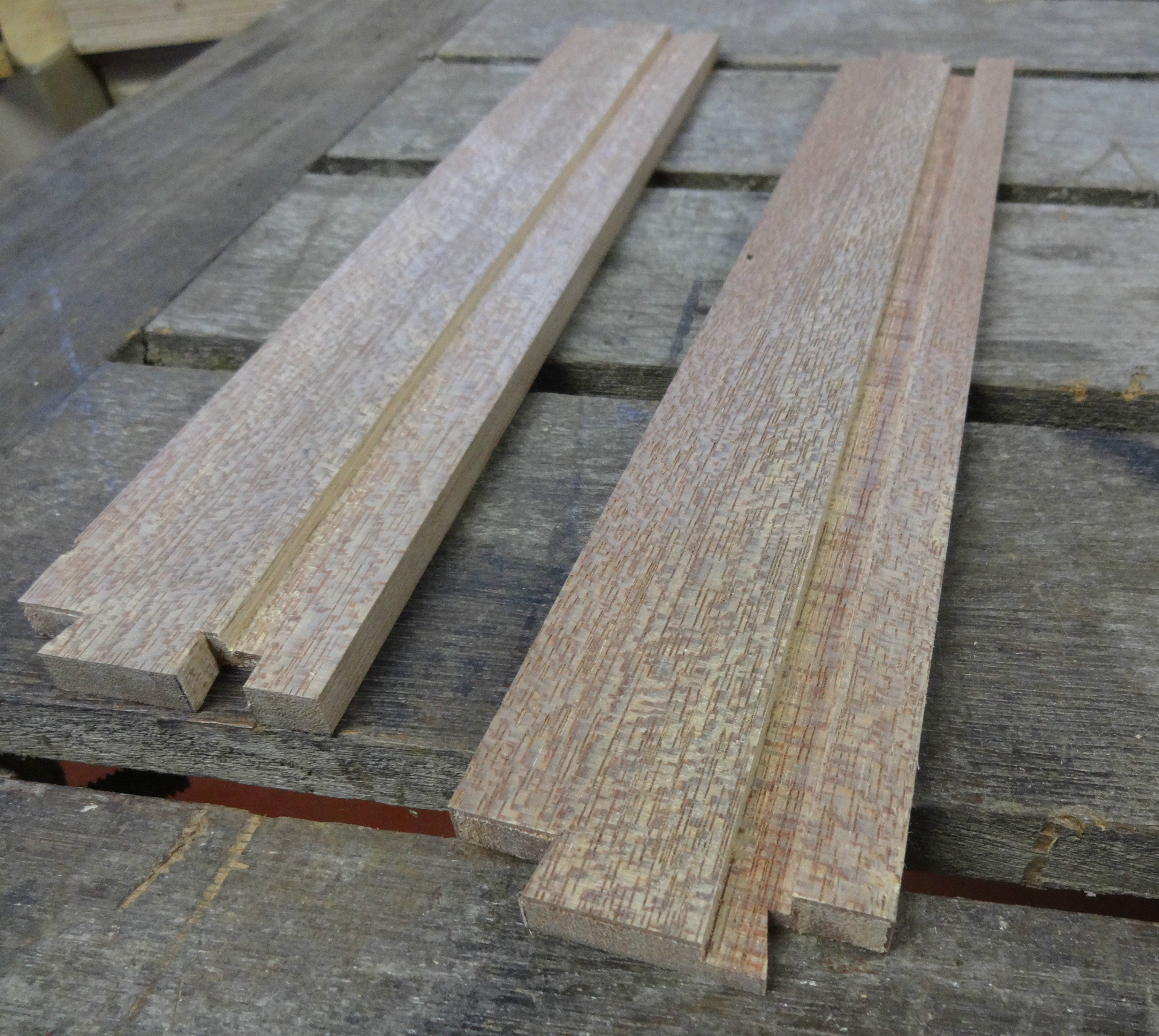 To be able to plough a groove, I used the clamp-in-the-vise trick (pic 5). I used a Record 044 plough plane with a 1/4 inch cutter (6.35 mm) and set the depth stop to 3 mm. I should have set the fence so that the bottom of the groove lined up with the red line (pic 6), but I made a mistake. At this point I hadn't even noticed yet. So my tail pieces with grooves look like this:
