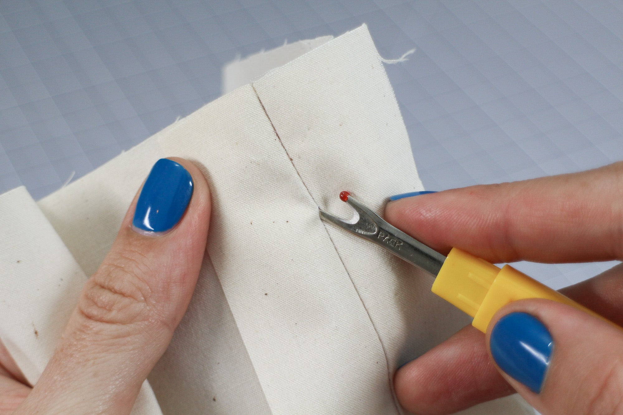 Wedge the sharp pointy end between your stitches like this and cut them with the little blade in the dip of the claw. Be careful not to cut through the fabric itself.