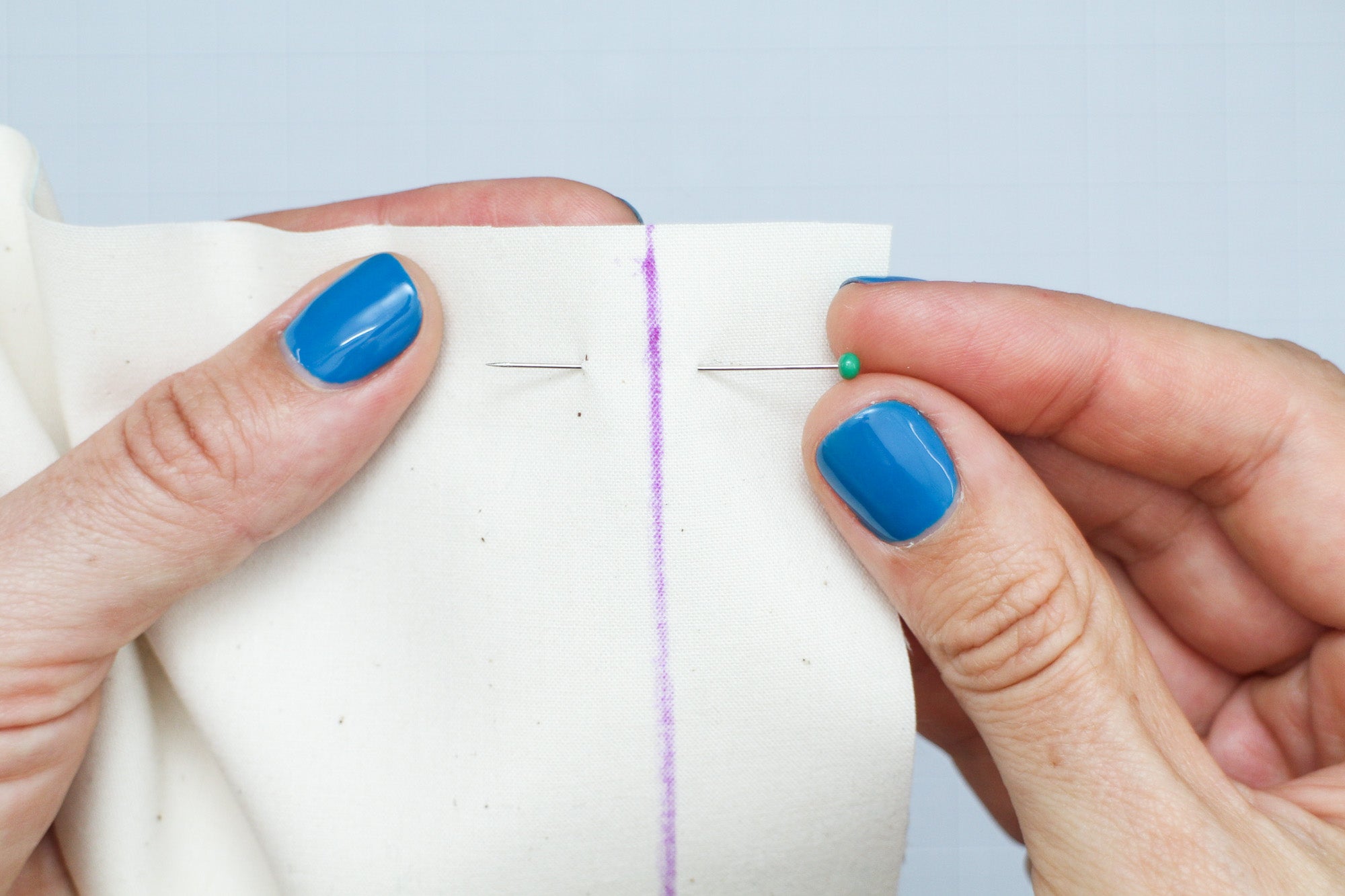 To properly pin a seam for sewing, stick your pins in perpendicular to your sewing line with the heads of the pins facing out towards the edge of the fabric. This will let you sew over the pins if you have to, or make them easier to take out as your sew. Weave the pins in and out of the fabric so they are going under the sewing line you marked.