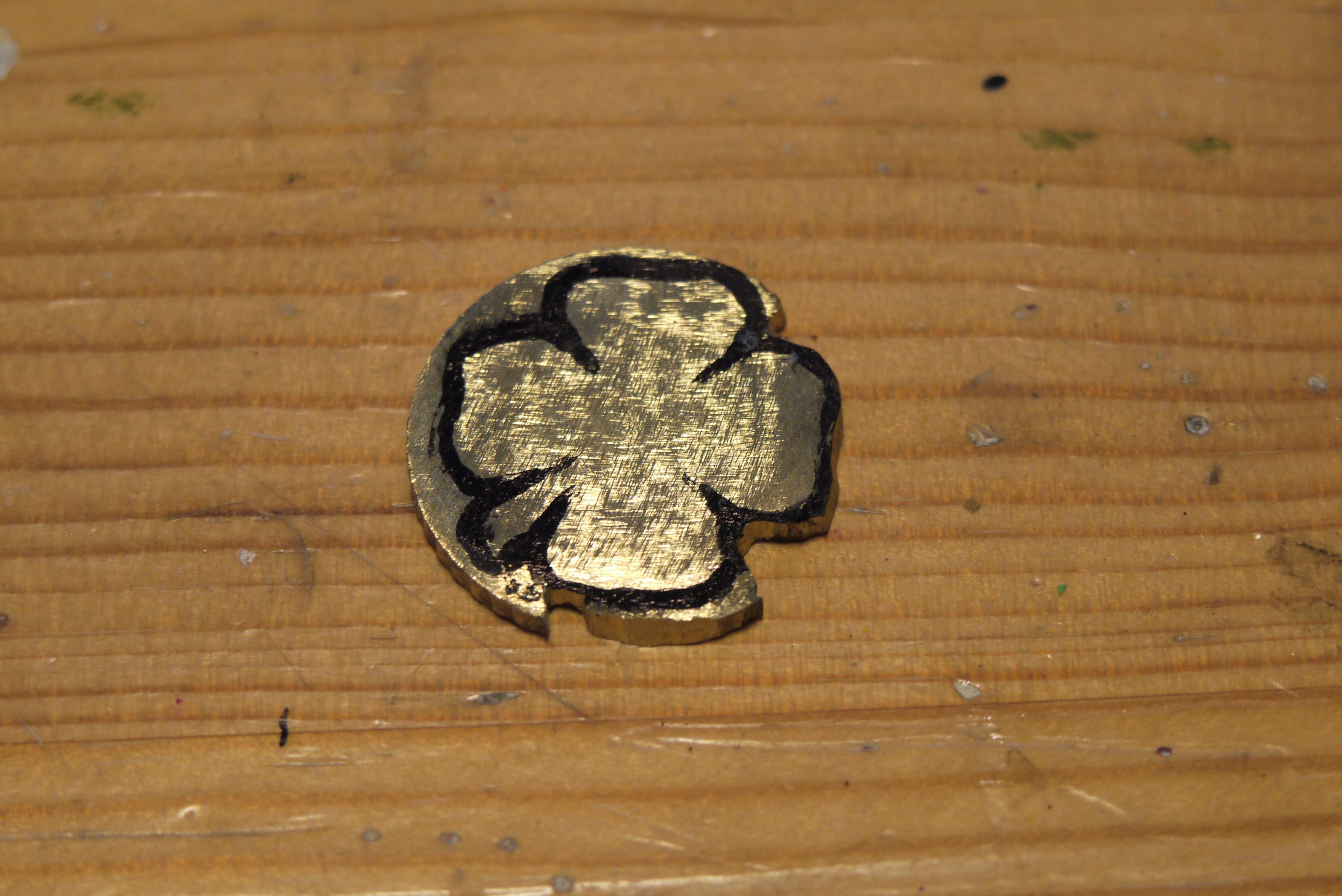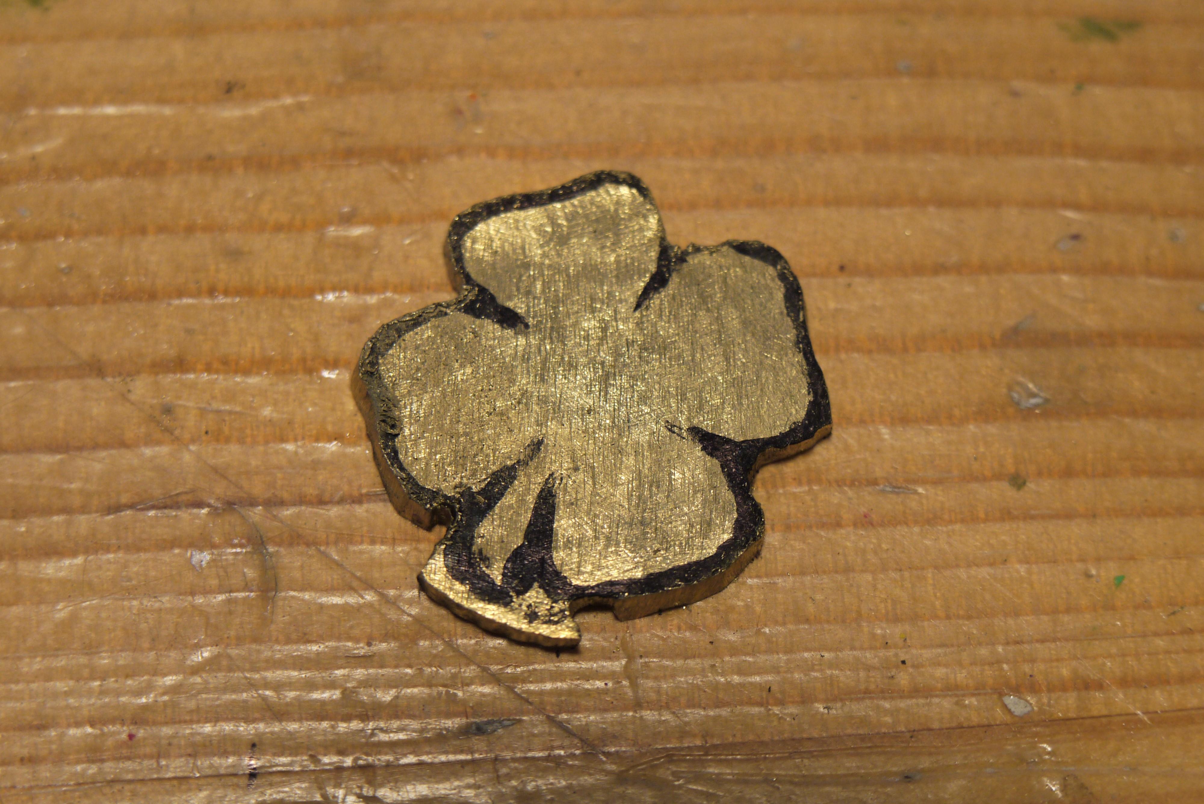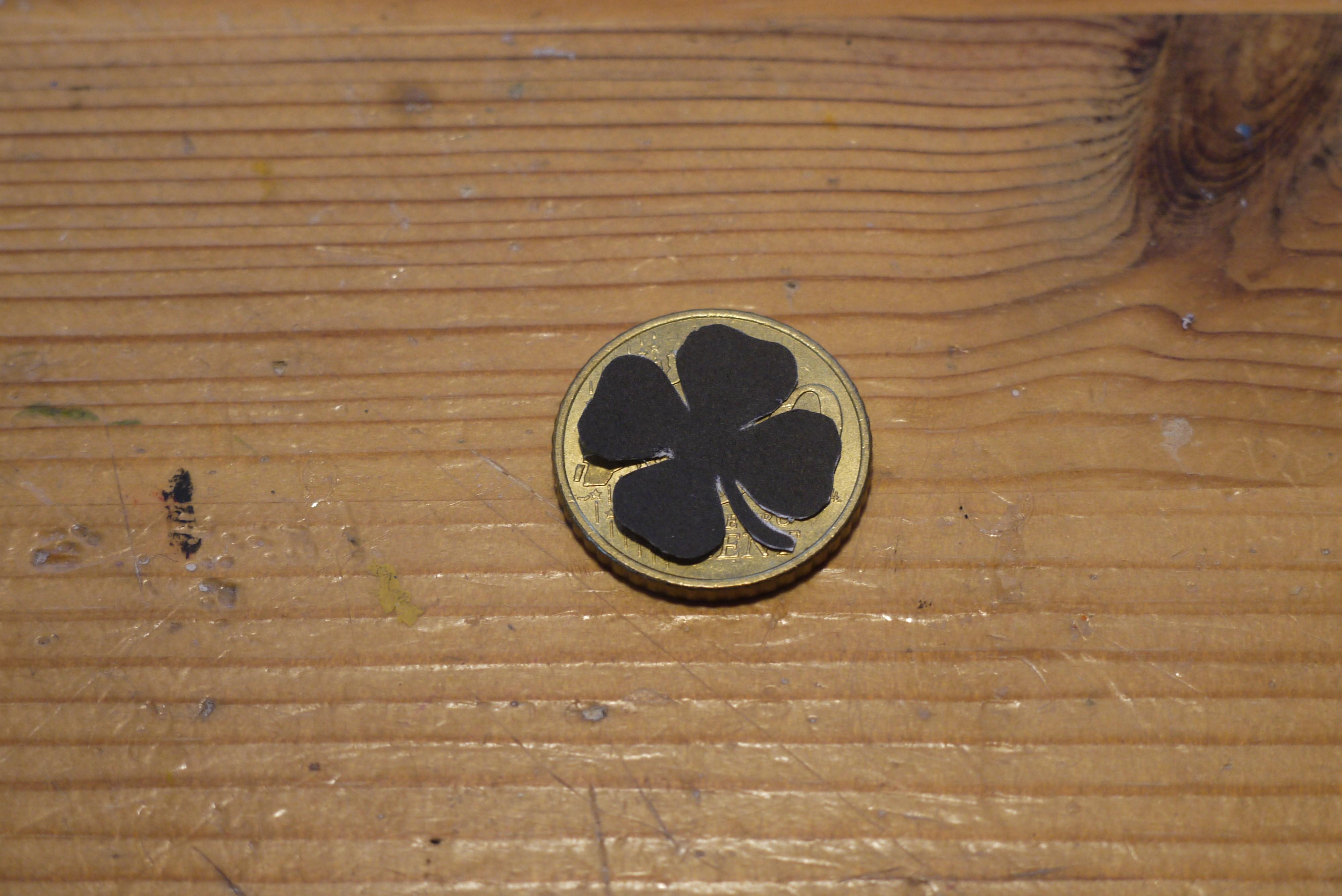 Meanwhile print out a template. There are thousands of results when you search for 'four leaf clover silhouette' or similar. (To get the graphic to a suitable size you could use Microsoft word: Insert the picture, do a right click on your mouse, there should be written something like size & position). Then cut it out and transfer the shape with a waterproof sharpie onto the coin.