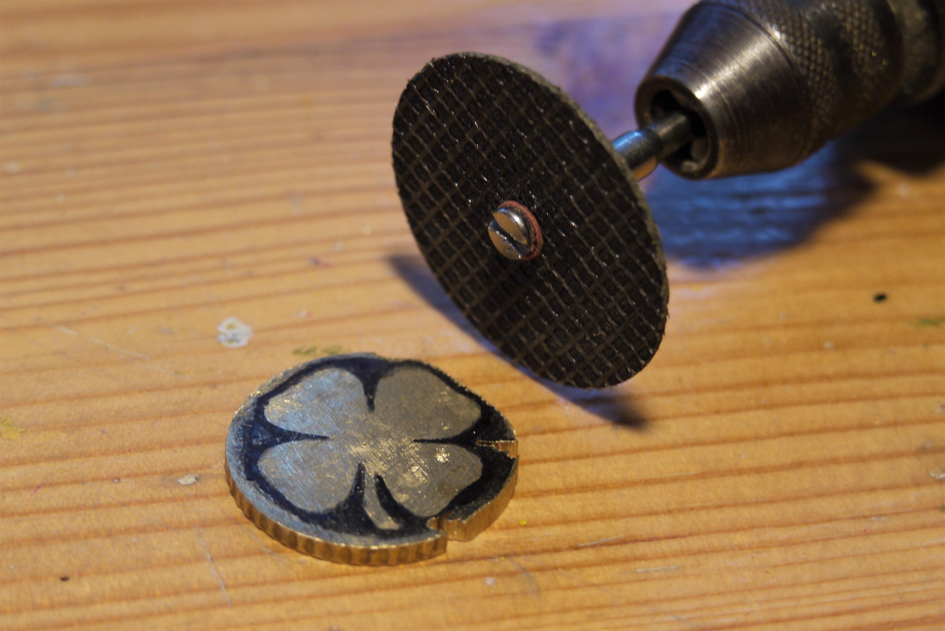 Now the most time-consuming part: sanding. I used 600 grit sandpaper first to even out all scratches from defacing the coin. To speed this in the beginning up, you can cut a small strip, roll it around the sand drum and fasten it in place with a small amount of supe glue. Then (after hours of working) I moved on to 1200 grit paper. I got most of the previously made marks out and thought the polishing would let the tiny scratches disappear. That was obviously not the case and now I have tiny polished scratches in the leaf clover. Make sure to remove at best ALL marks before polishing. To sand the inside edges, you can put tape on the back of the sandpaper preventing it to rip apart. Using water helps to sand finer / make less new scratches. For the texture on the back I just used a mini diamond bit with really slight pressure.