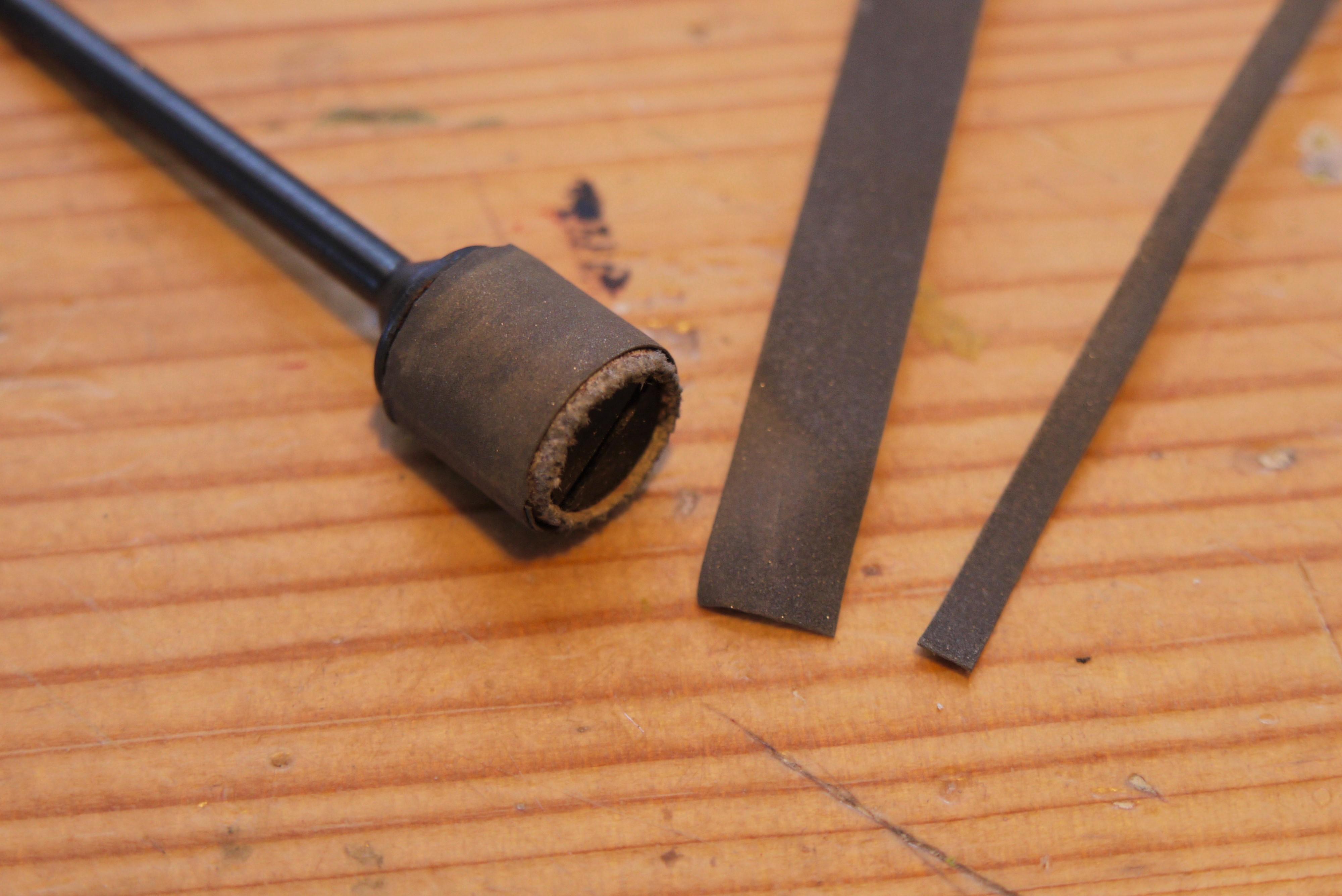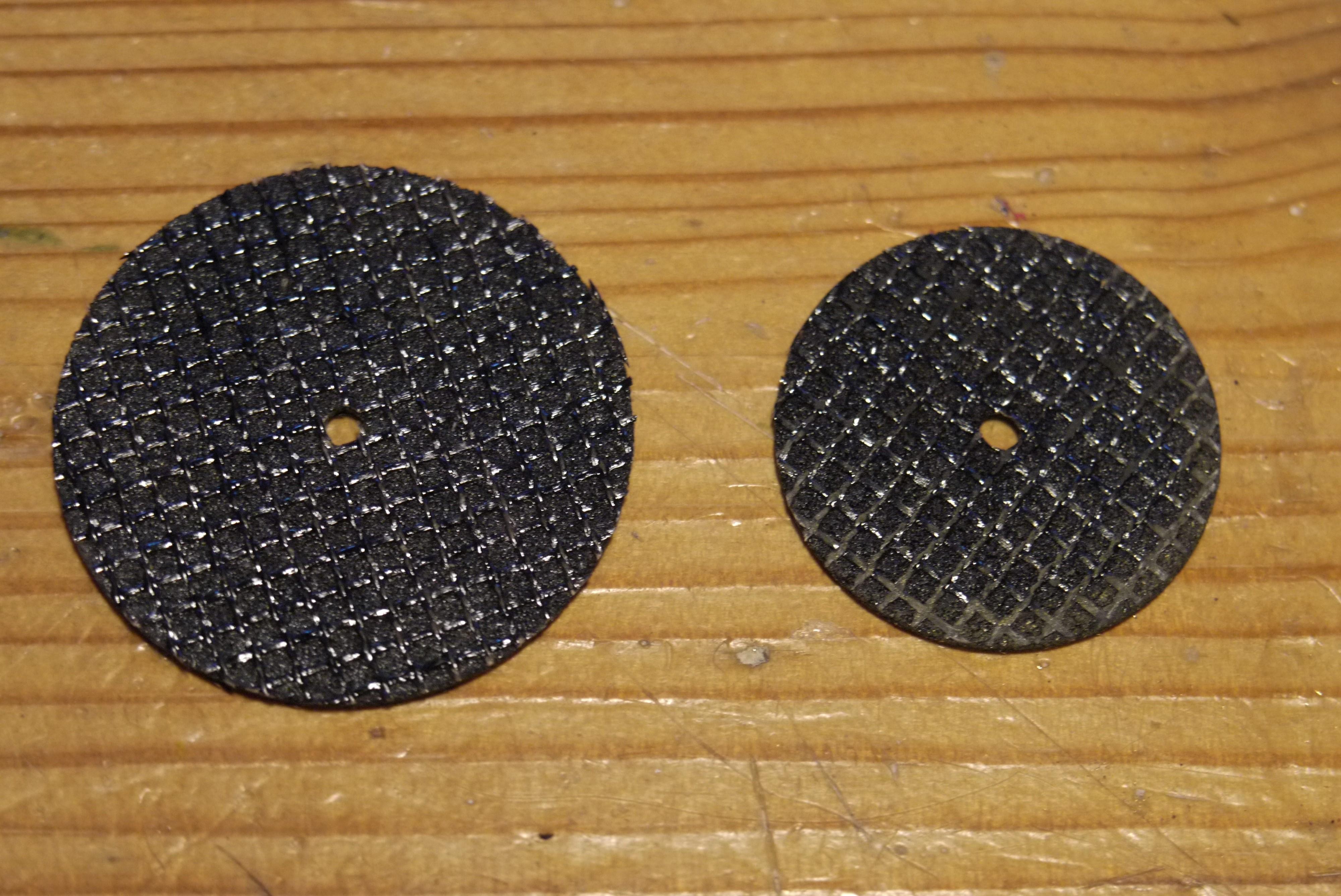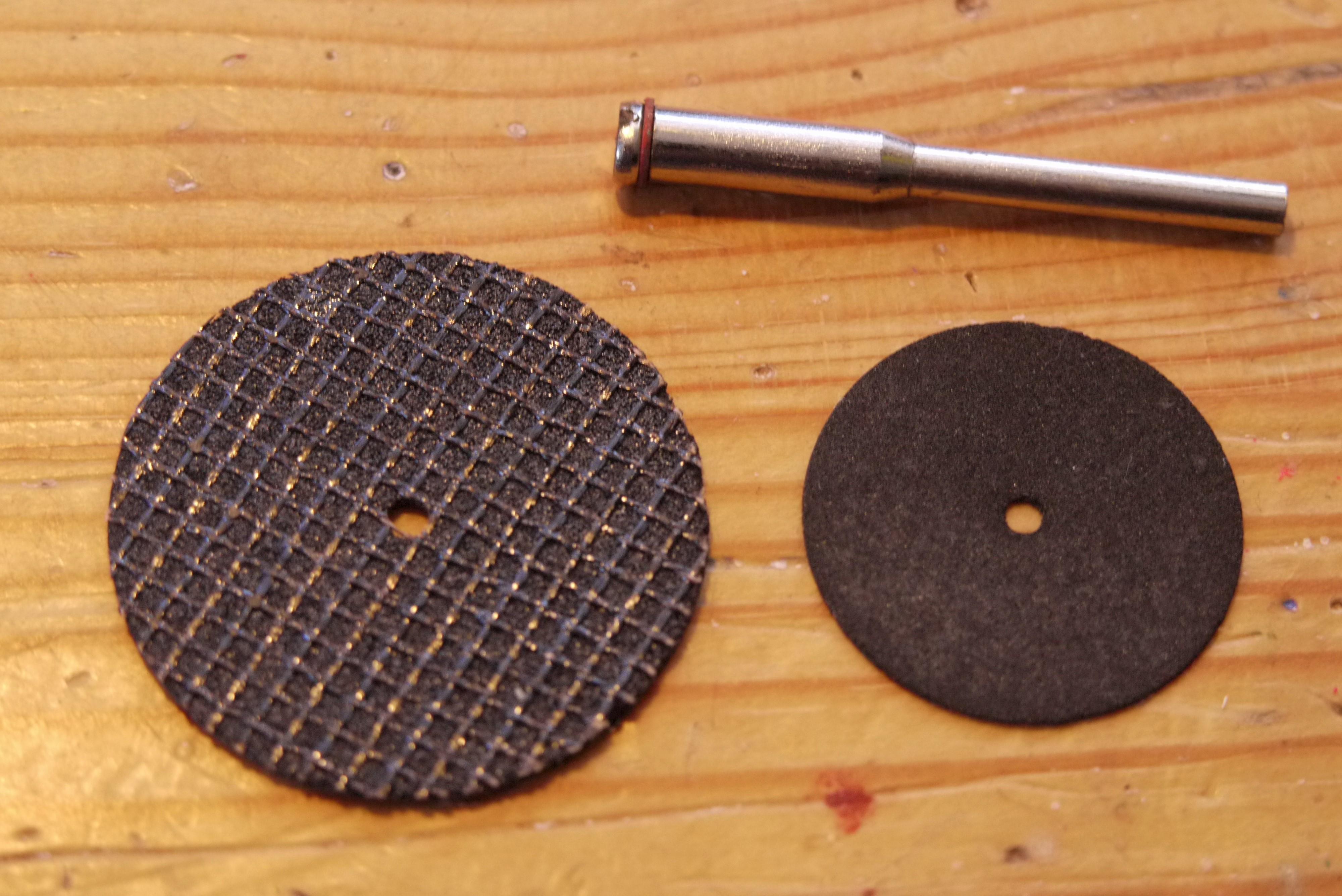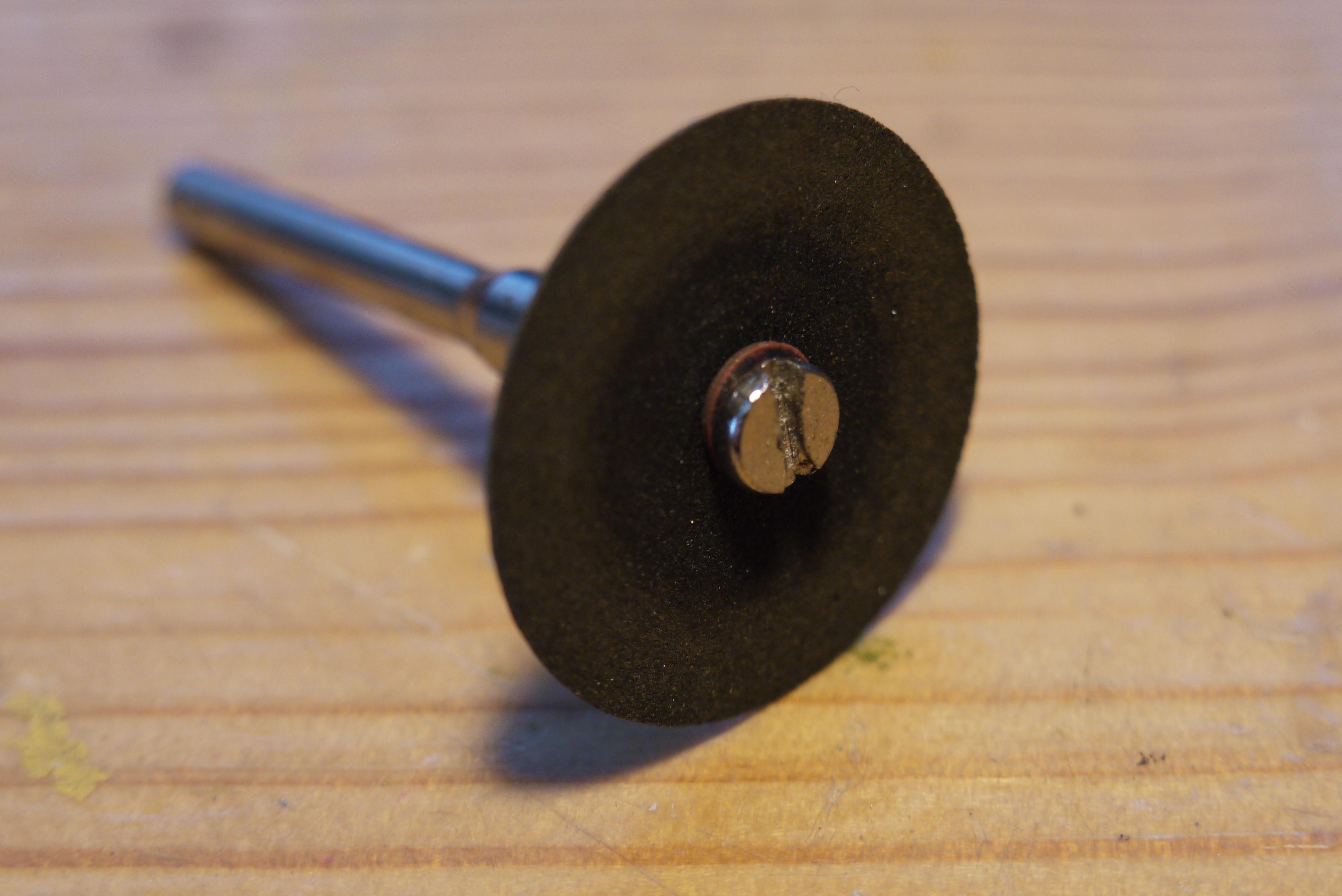 For the finer shape I first cut slots with a fretsaw to the centre. Thereafter I used the cutting disk shown in the pictures. On a website I visited they were called abrasive cutting wheels. (If you want to look by yourself, this guy also explains the most important Dremel bits: https://blueroofdesigns.com/2009/07/29/what-are-these-dremel-thingies-for/ ). These discs are very fragile and break if you put too much pressure on them, so you are forced to work slow and gingerly. I tried to compensate all dents I left in the step ahead and create some kind of a round bevel.