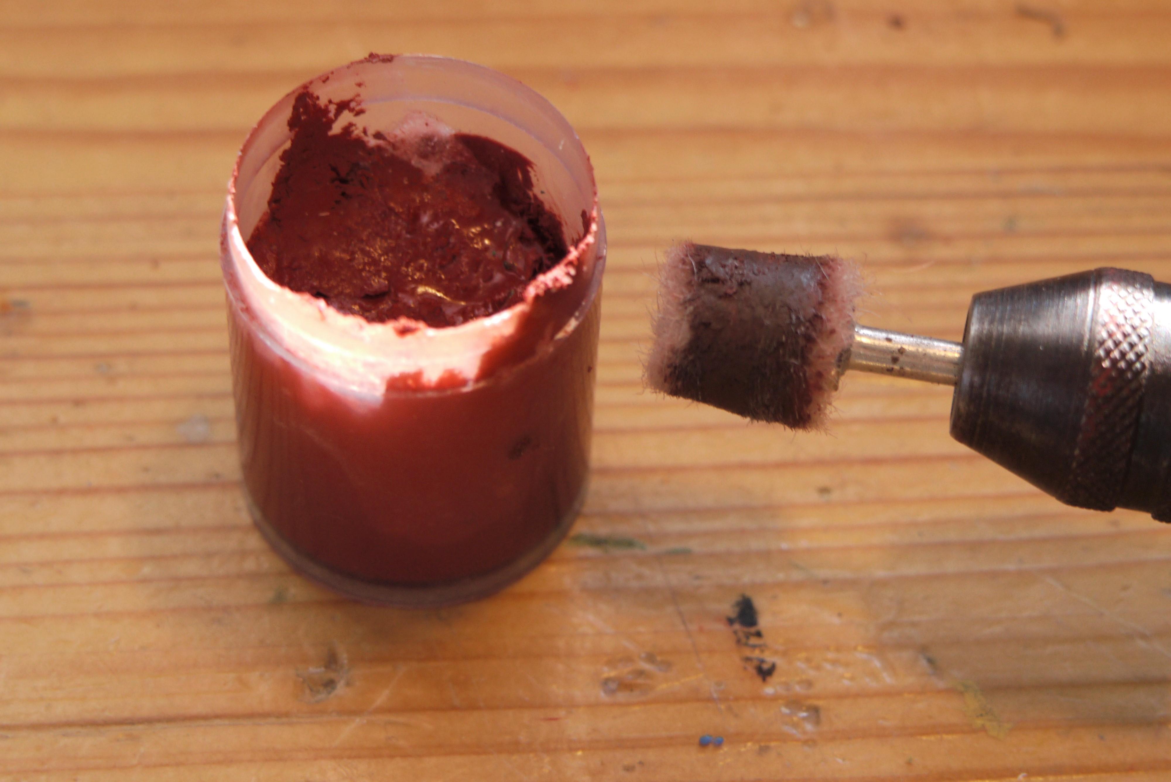 To make the coin shiny, apply polishing compound all around the polishing felt. Keep it a little bit wet. If you turn on the rotary tool, this paste will be catapulted everywhere so keep that in mind, maybe go outside. Use circular movements to polish. The compound will get the coin to an acceptable shine, but if you want to make it extra resplendent, repeat this step with tooth paste. The two last pictures are a comparison before and after tooth paste.