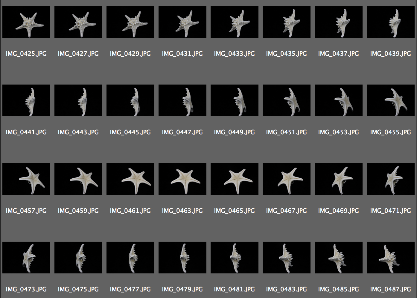 Next, move your camera on your tripod to a higher or lower angle and repeat the same process. You need to capture every area of the object, especially any crevices, overhangs or details. Sometimes you also need to shoot a few vertical rows to get the bottom and top of the object. If your object has a lot of really fine textural details that you want to capture, you can also shoot some very close up detail shots to capture those.