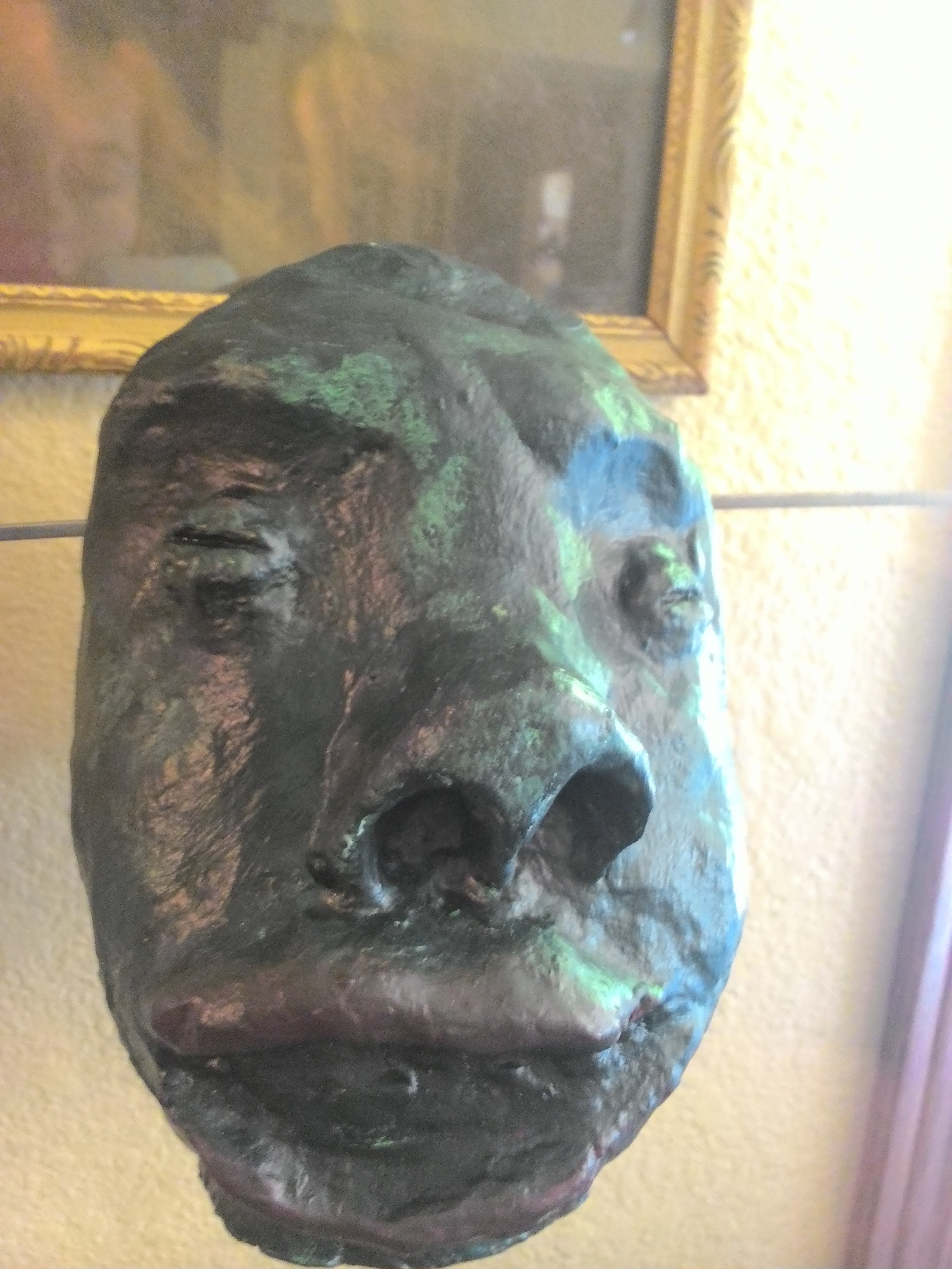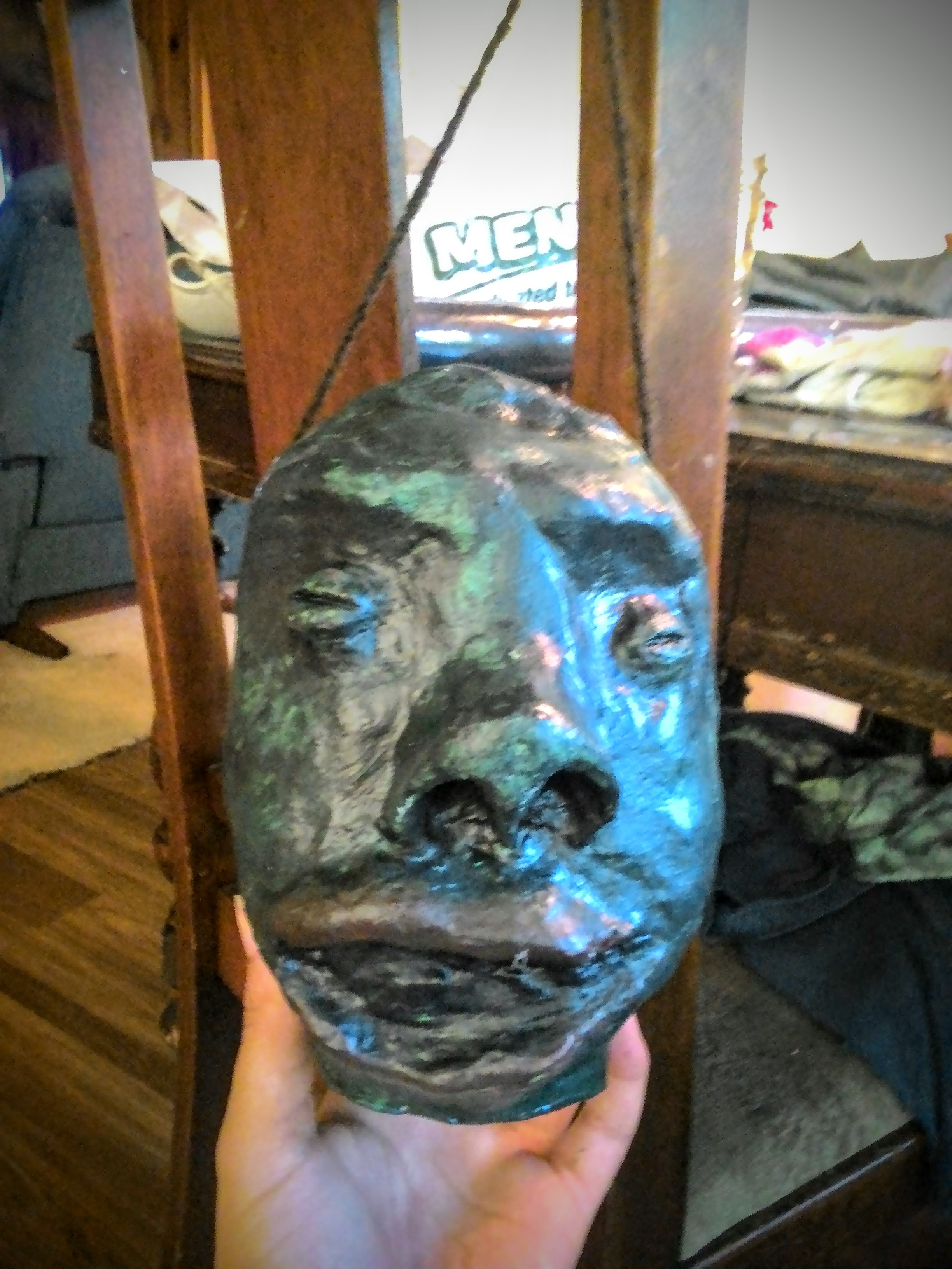 Ernie, the Knight Bus driver, has a sweet talking shrunken head, to keep him company on his many driving adventures. I made the shrunken head from Harry Potter for one of my fellow Pottheads who just got his license, but I never gave it to him because I loved the look of a severed head hanging from my ceiling for Halloween :).
