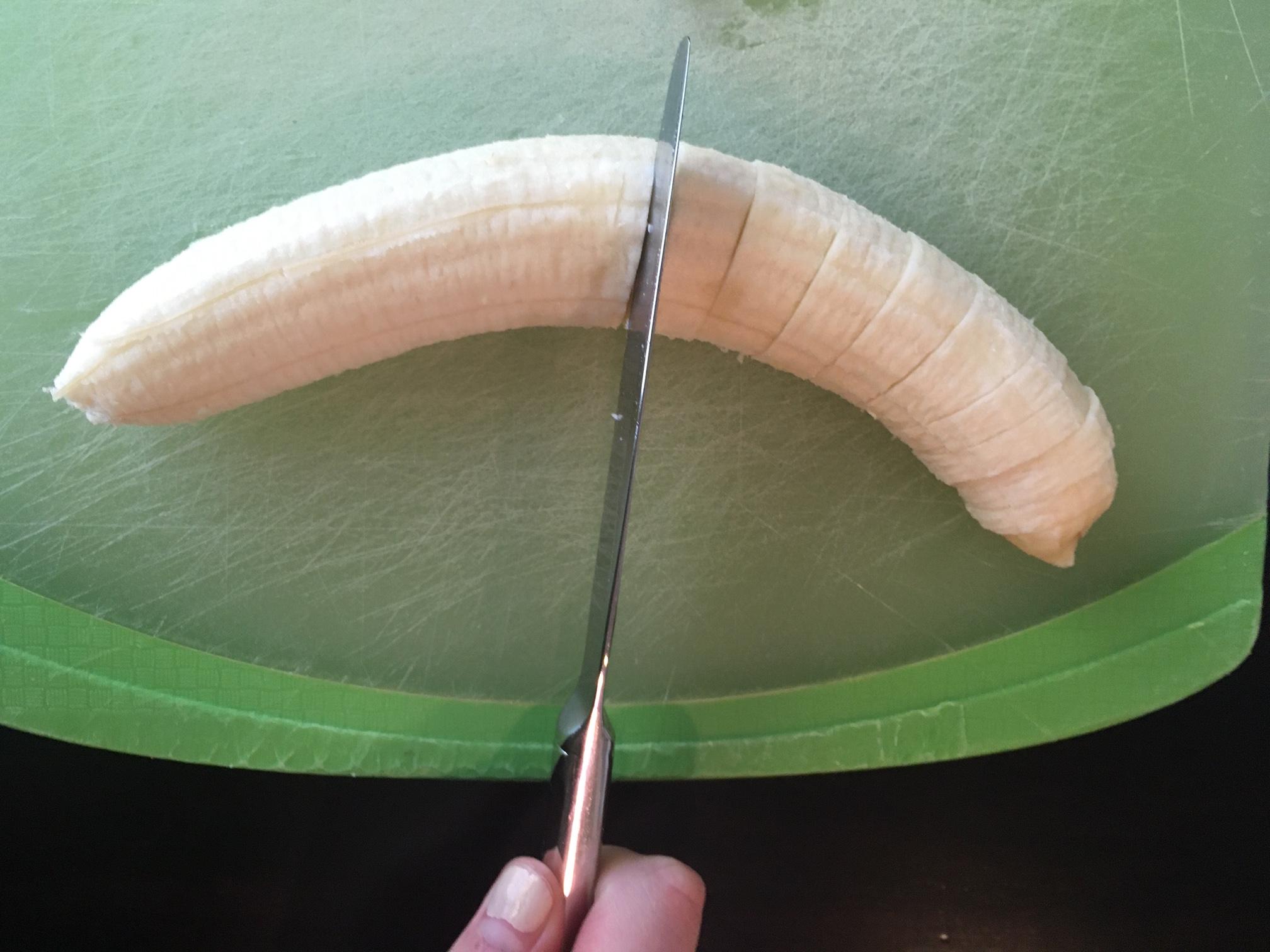 I used about 3/4s of a large banana: any amount works, depending on how many sandwiches you intend to make. I also cut them about 1/2 an inch wide. When you are done, place in the second bowl (the smaller one contained the coco chips and nuts).