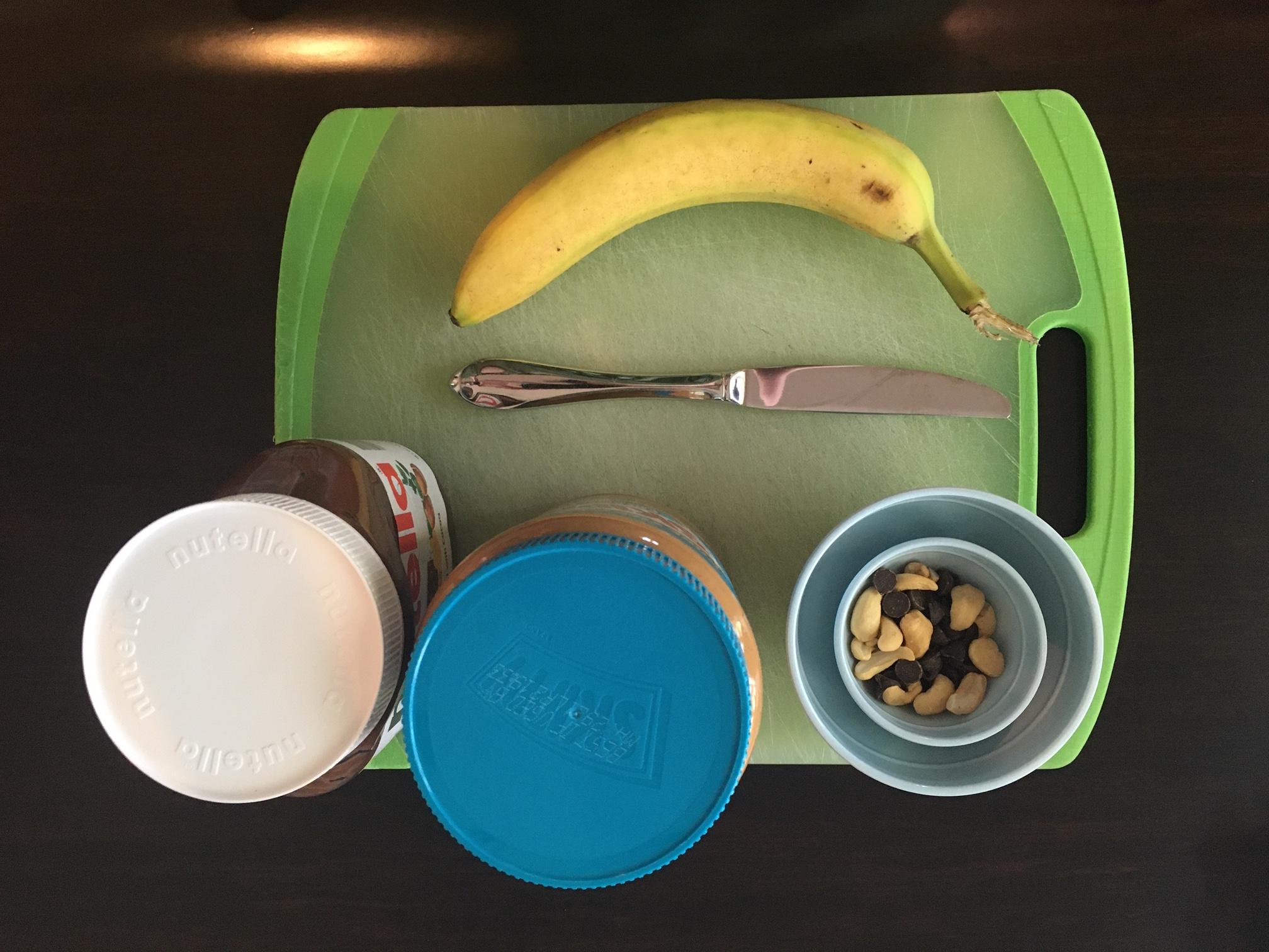 Gather your Banana, Nutella, Peanut Butter, Chocolate Chips/Cashews, Knife, Cutting Board, and Bowls.