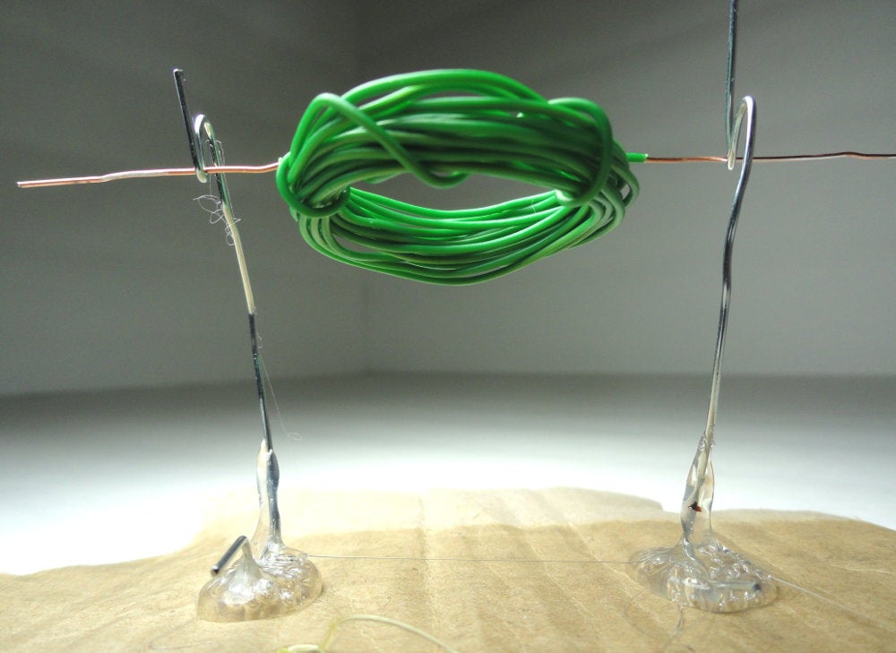 Take your wire and place it on the stand. It should have good contact with the paperclip and be fairly level. You may need to bend the holding spot so that the coil will not jump off the stand as ours did the first time we started it. It should look something like the picture.