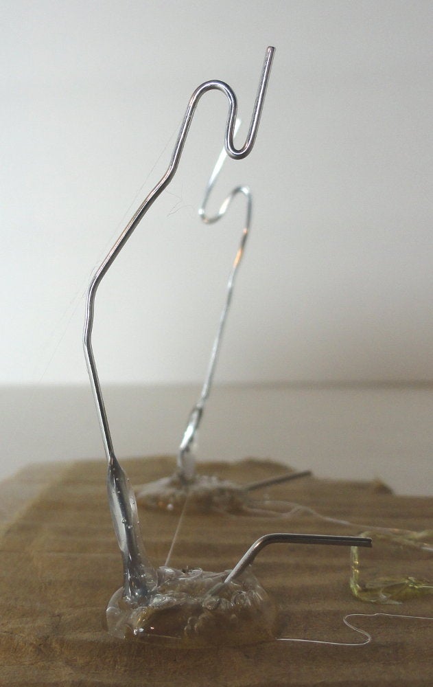 Before you start this step, you might want to plug in your hot glue gun and get it warmed up so it will be good to go when you need it. Now take your two metal paper clips and bend them to look like a stand. You can do this with your hands alone, but if you need some extra leverage or want to keep your hands nice and soft then use pliers to bend it into shape. You can see that you will need room at the bottom of the stand to attach the alligator clips.