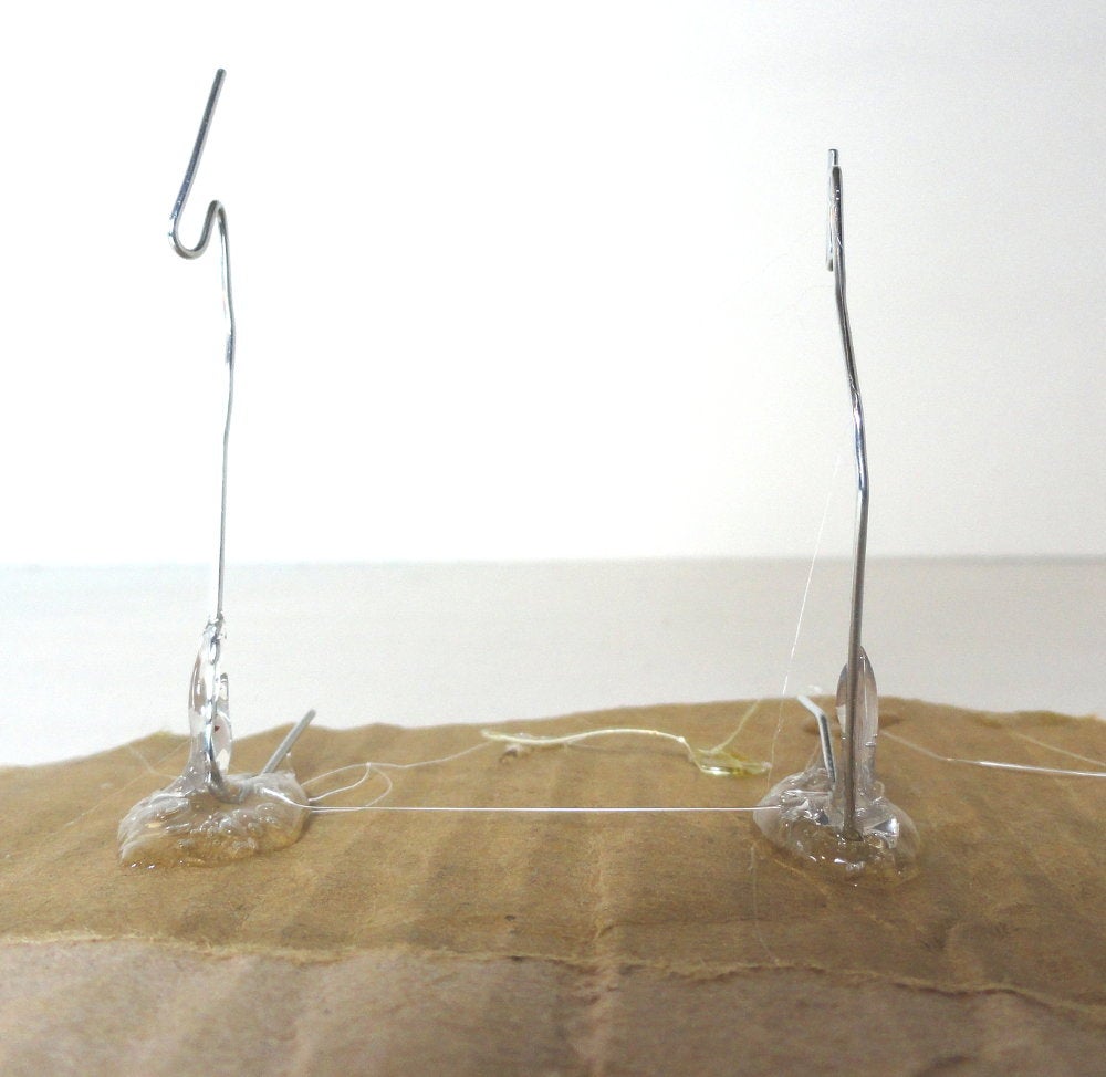 Now that you have your paper clips bent, take a piece of cardboard and cut it to a size that seems appropriate. Use your hot glue gun and glue the stands down to the cardboard. Make sure that your stands are placed just the right amount apart according to the width of your coiled wire.