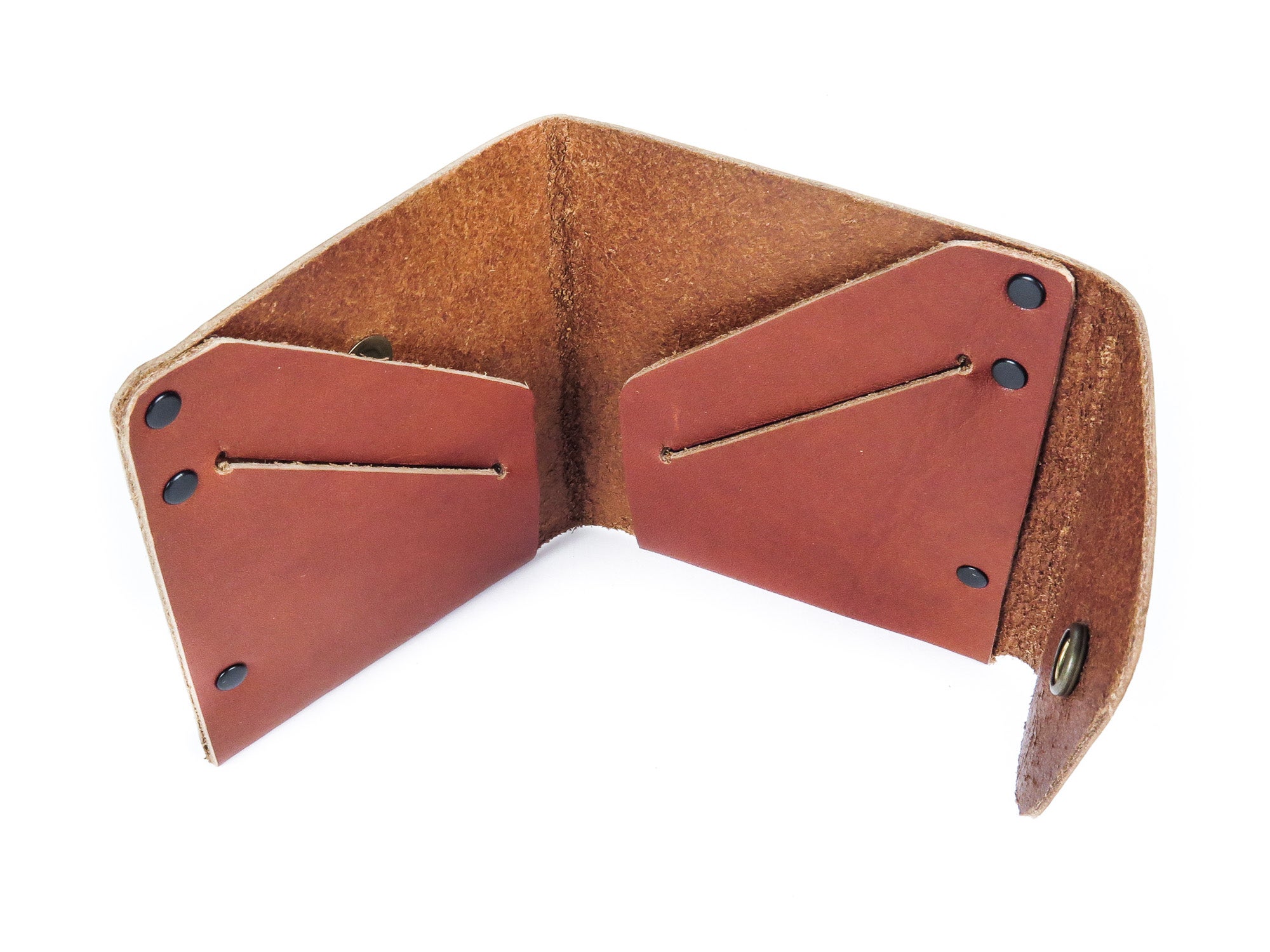 The wallet we'll be making is a simple but practical design. It is made entirely from one piece of leather with a bill compartment formed by two folded flaps, and two card slots that are just slits cut in the leather. The whole thing is held together by only 6 rivets, making it ridiculously easy to construct. I've also added a flap that snaps the wallet shut to help all my various cards stay where they belong.