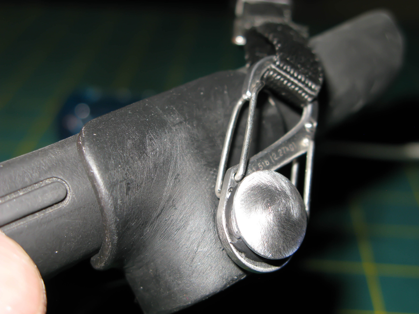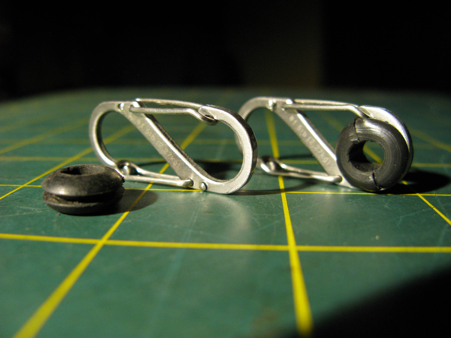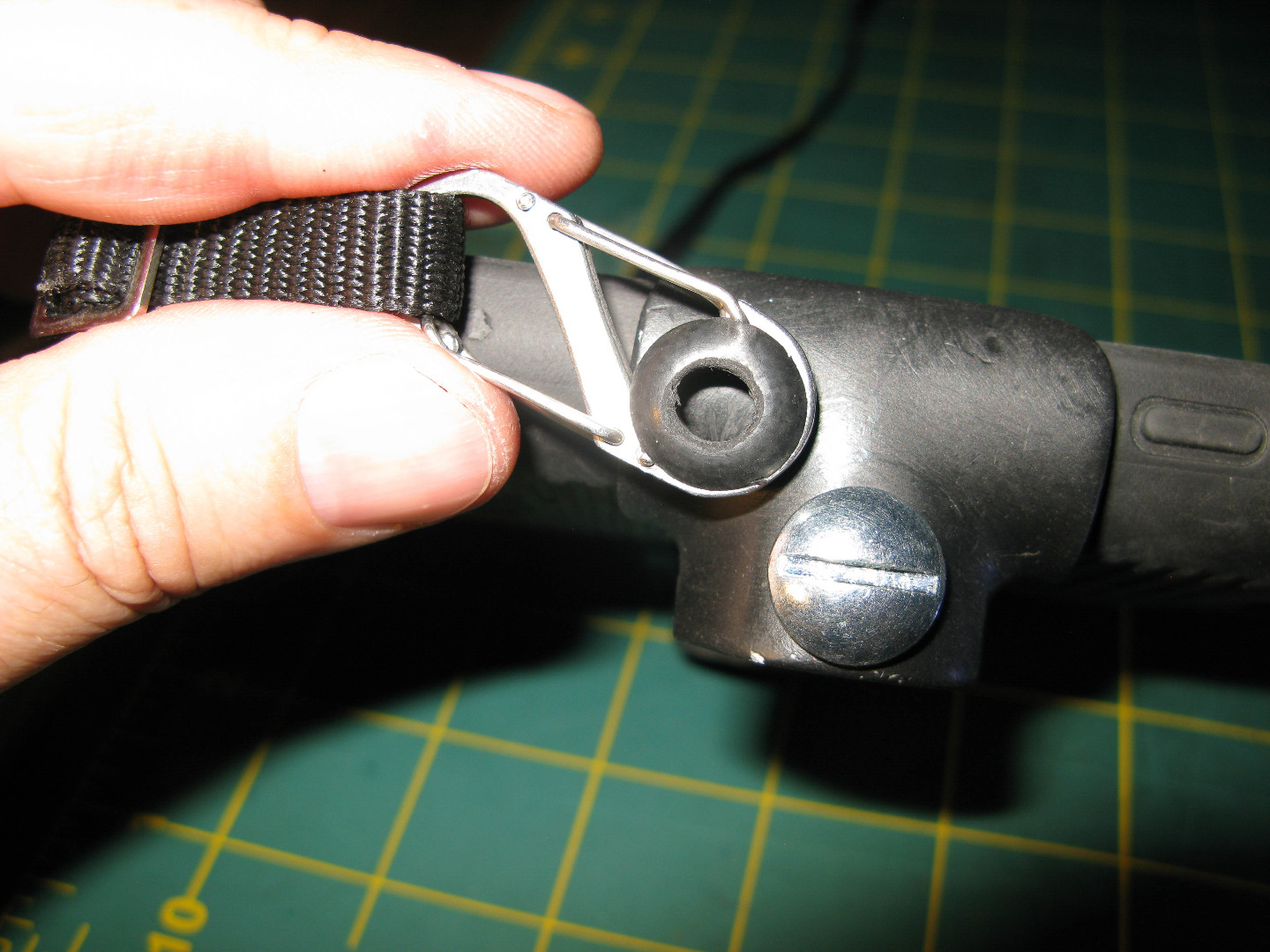 "S" Biners: Insert the 1/4" rubber grommet into both of the biners as shown. Back off the threaded bolt that holds the 2 pieces together and slide the bolt through the 1st biner as shown. Re-assemble the camera mount snugging it tight. The bottom piece should still have the extra threaded space at the bottom. Slide the other biner onto the shorter 1/4" bolt that I mentioned in the parts list. Finally threaded it in the bottom and your ready to add any neck strap you want. Mine is rip-stop nylon.