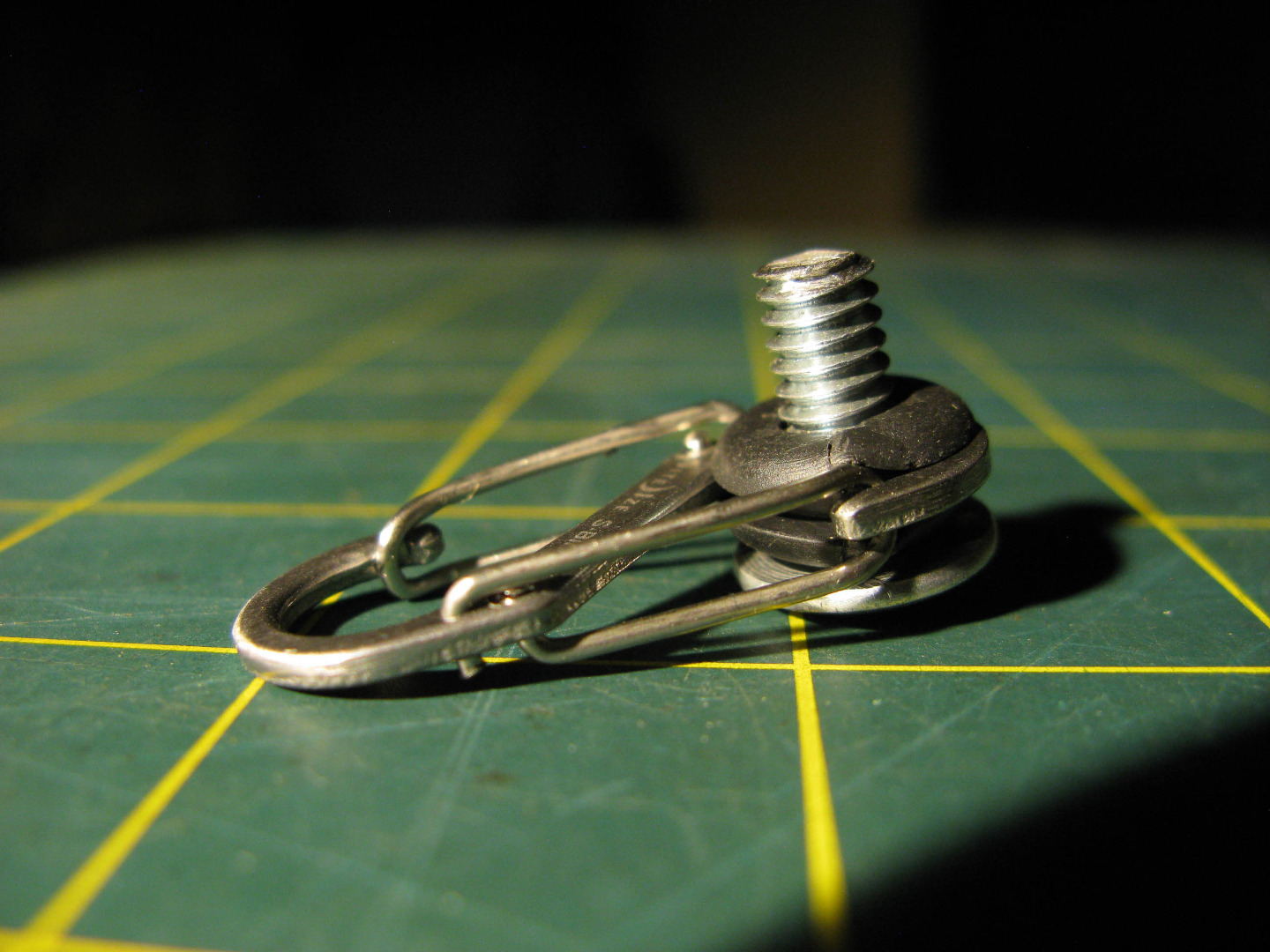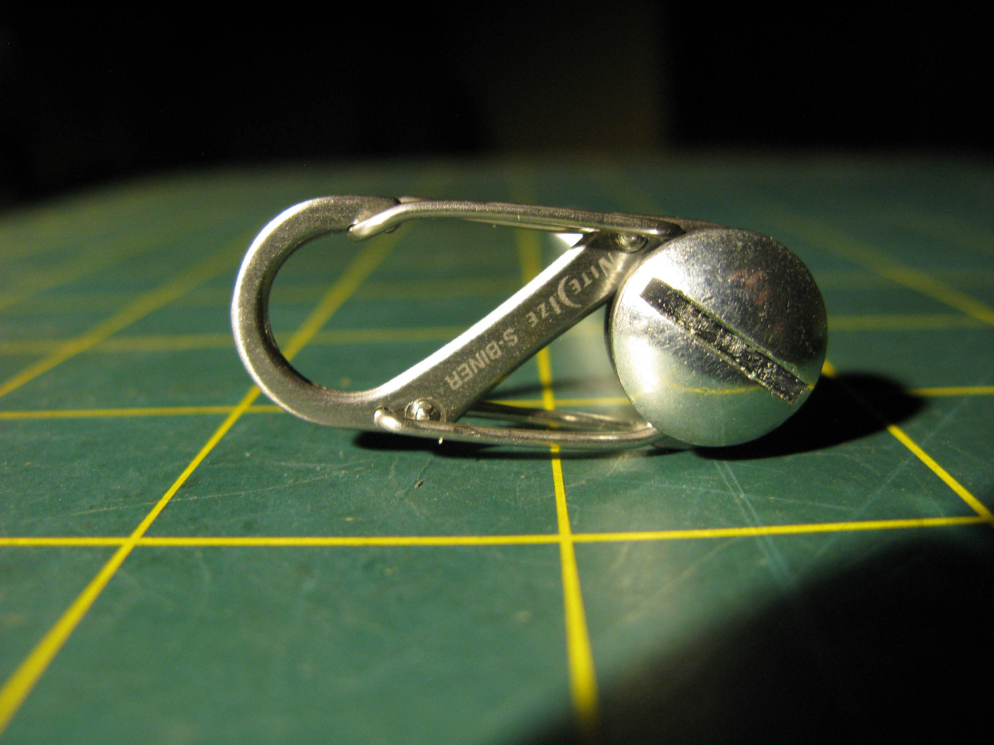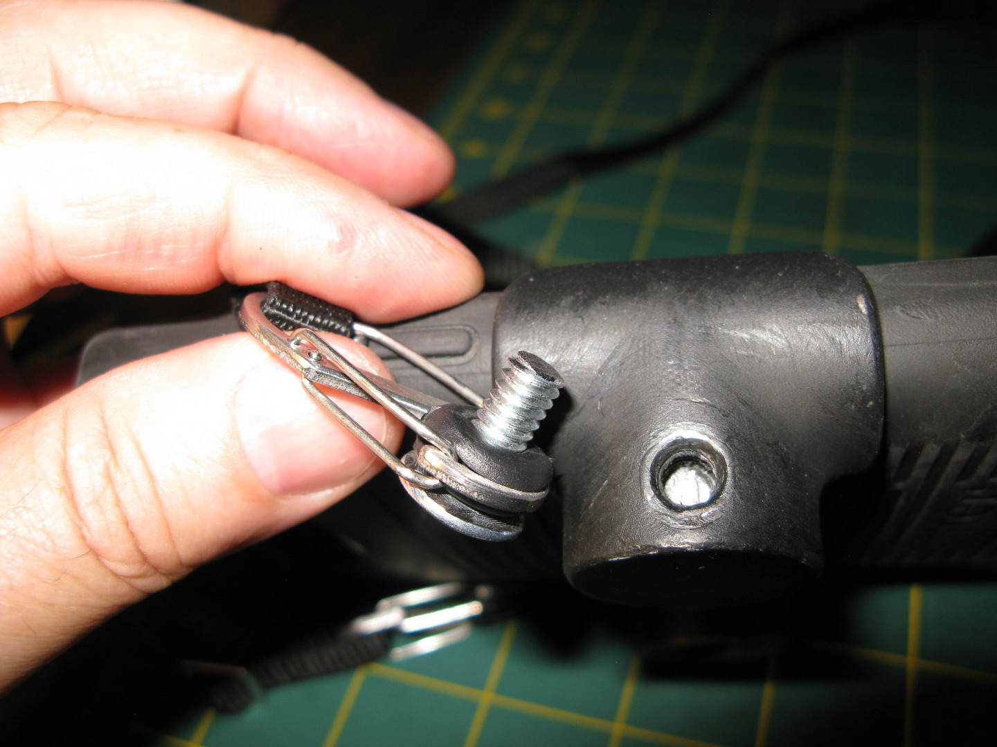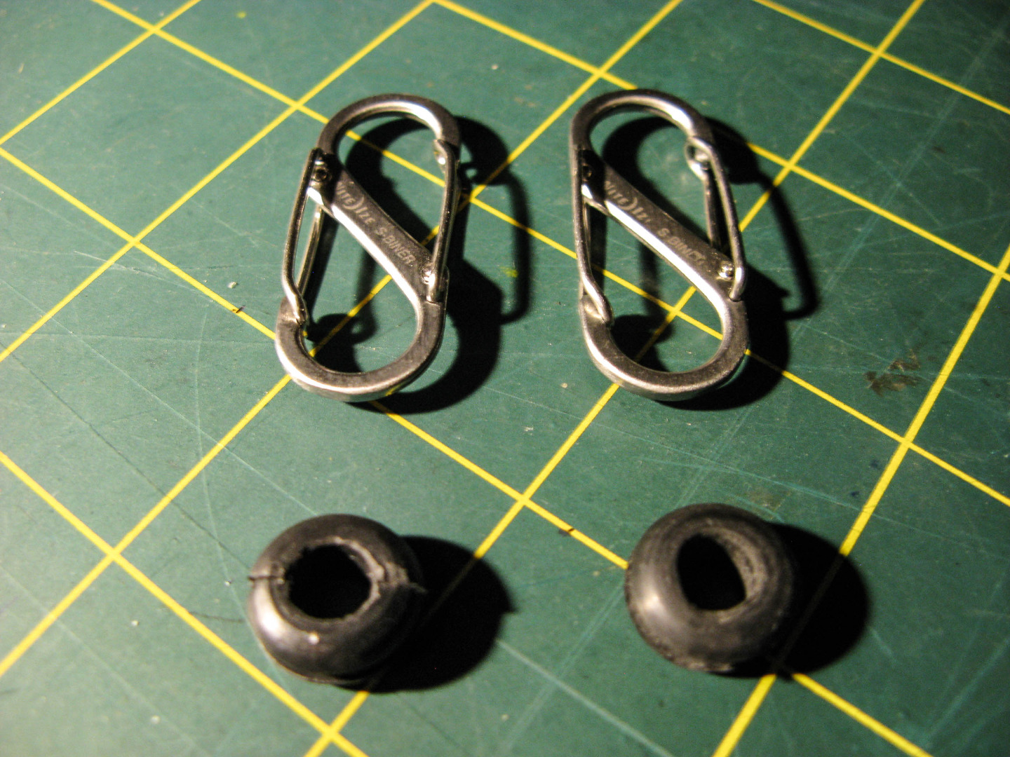 "S" Biners: Insert the 1/4" rubber grommet into both of the biners as shown. Back off the threaded bolt that holds the 2 pieces together and slide the bolt through the 1st biner as shown. Re-assemble the camera mount snugging it tight. The bottom piece should still have the extra threaded space at the bottom. Slide the other biner onto the shorter 1/4" bolt that I mentioned in the parts list. Finally threaded it in the bottom and your ready to add any neck strap you want. Mine is rip-stop nylon.