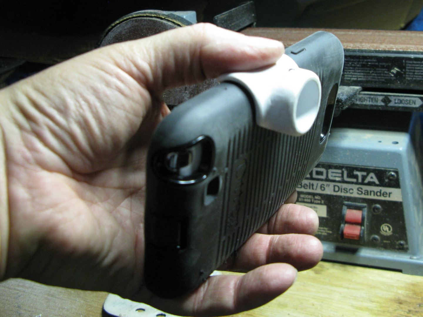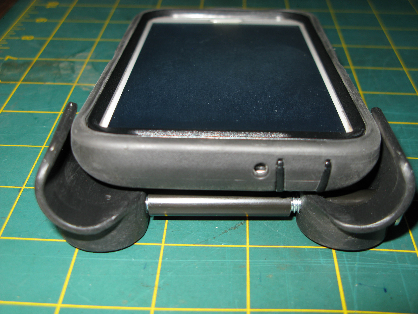 Now comes the fun part. If you did everything right (fingers crossed) then you should be able to slide the 3/8" grommet onto the threaded bolt for grip (optional), slide the bolt through the hole in the top piece (cradle facing phone), insert a short piece of colored drinking straw (to cover the threads) in the top piece, back across the back of the phone sliding the bolt through another piece of color drinking straw, and thread the bolt through the bottom piece (cradle facing the phone). If all goes well you should have a little more than 1/4" of thread left in the bottom of the bottom piece. Depending on the shape of your phone/case, the edge of the cradle might extend over onto the face of the phone. If so, then mark and cut the excess off and smooth the threads.