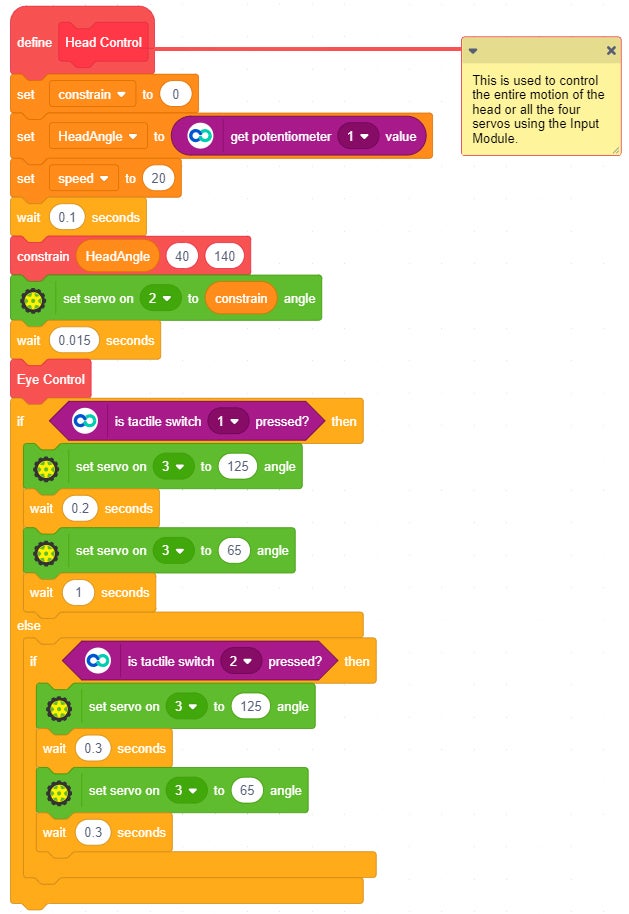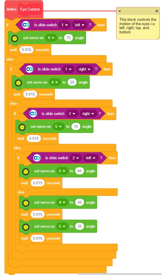 The two micro servos are attached in the eye mechanism. They can be controlled using the Slide switches of the Input Module.