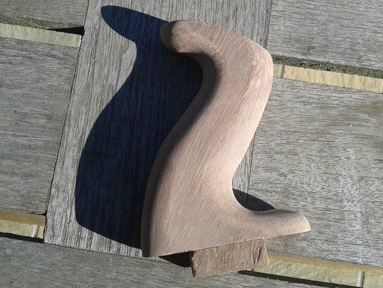 While the frog was still attached, I put the adjusting knob back on and set the sides loosely against our work piece to test how accessible the knob is. I decided to add a little indentation around the knob with a big gouge, to make it more comfortable to turn the knob (2nd picture). The rear part also has an arched back side (see plan), so repeat the same process as in previous step i.e. sawing and planing (picture 3). You can use the front piece as a template and trace it, so you get the exact same curve.