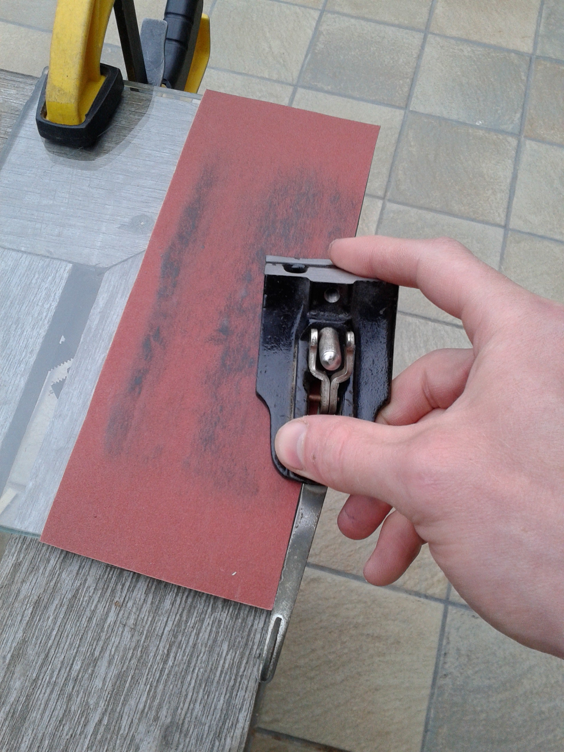 That glass plate from previous step now comes into play. Attach a long strip of coarse grit sandpaper (around 80 grit) to it with double-sided tape at the corners (5th picture). Avoid those corners, because the tape creates bumps. Before you start sanding, assemble the entire plane, because you want that tension from the cutting iron assembly. It makes a difference for metal planes, so I played it safe by assuming it also slightly bends the wooden body. Of course you need to retract the blade fully. Now simply sand back and forth until all pieces are flush. If you want, you can check your progress with pencil lines to make sure you're sanding the entire sole. The low spots will be revealed by left-over pencil marks. Now switch to a finer grit (around 220) and repeat. When you're done, also round over any sharp corners on all 4 sides (last picture). Follow the sweep of the curve for front and back, and sand at a 45° angle for the sides.