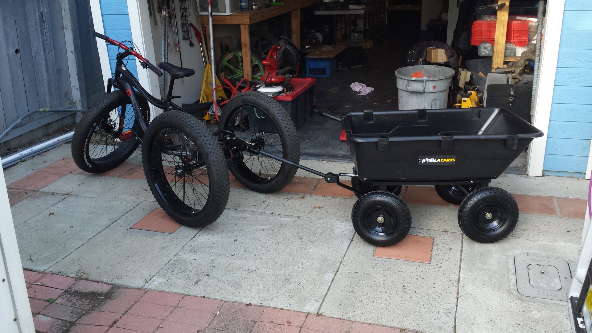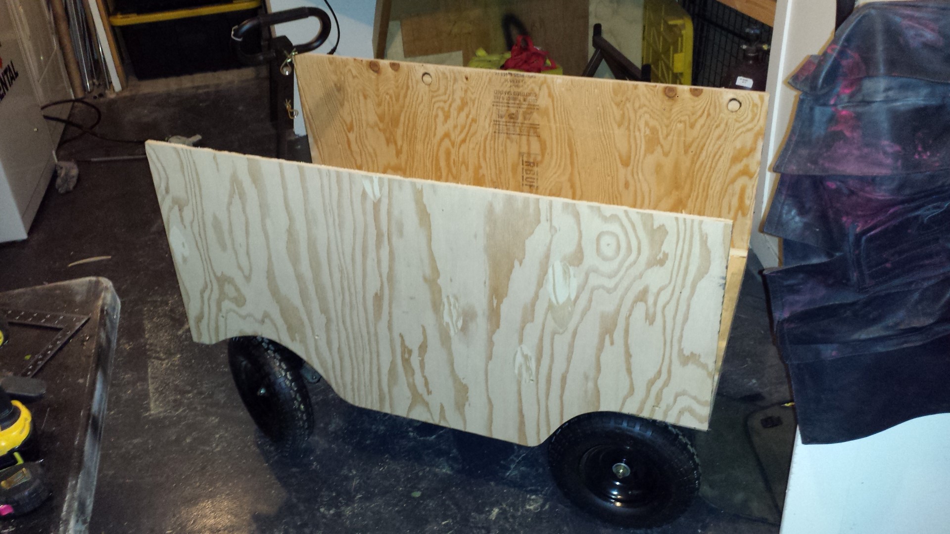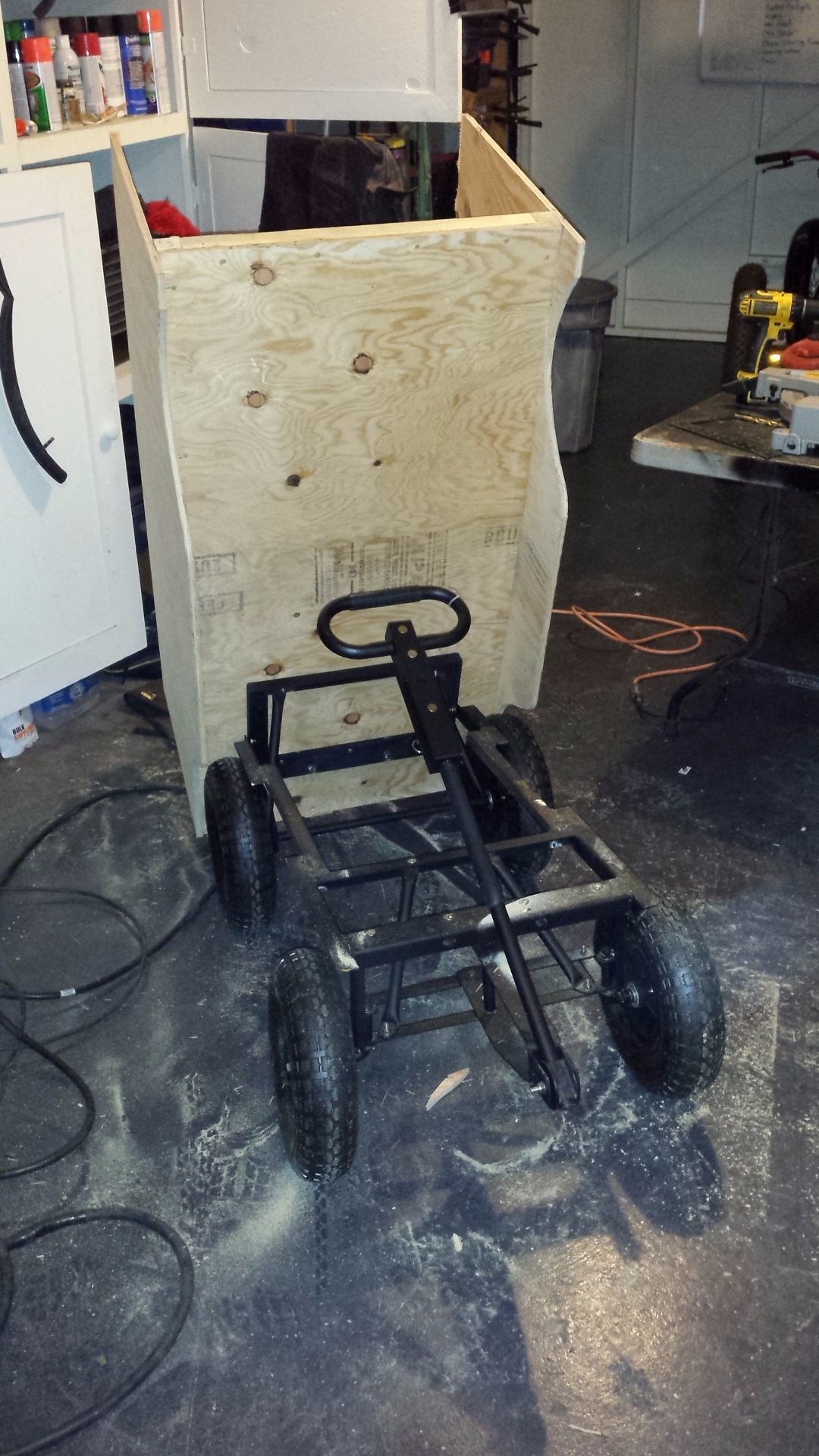Motors: As I mentioned earlier I would really like to motorize this with some electric wheelchair motors. This may require adding a couple more batteries, and I made sure to only use screws (no glue) in the front part of the box. This is so I can take the front off and rig up a drivers seat in the front 18" of the cart. I have some grand plans to use the trailer hitch that's built into the pull mechanism to hook this up to my tricycle, and get the cart to push the trike. This may be reeeaaally unstable, but you never know unless you try, right?