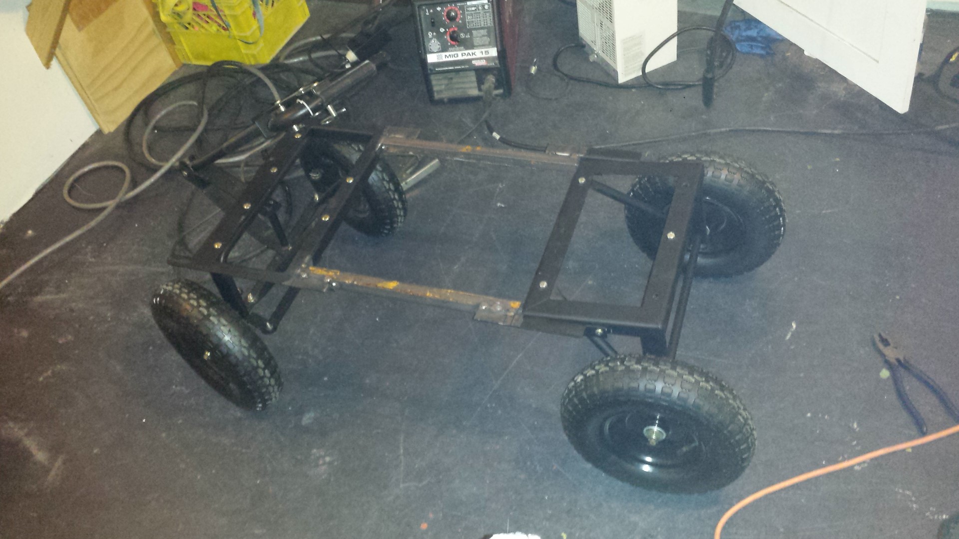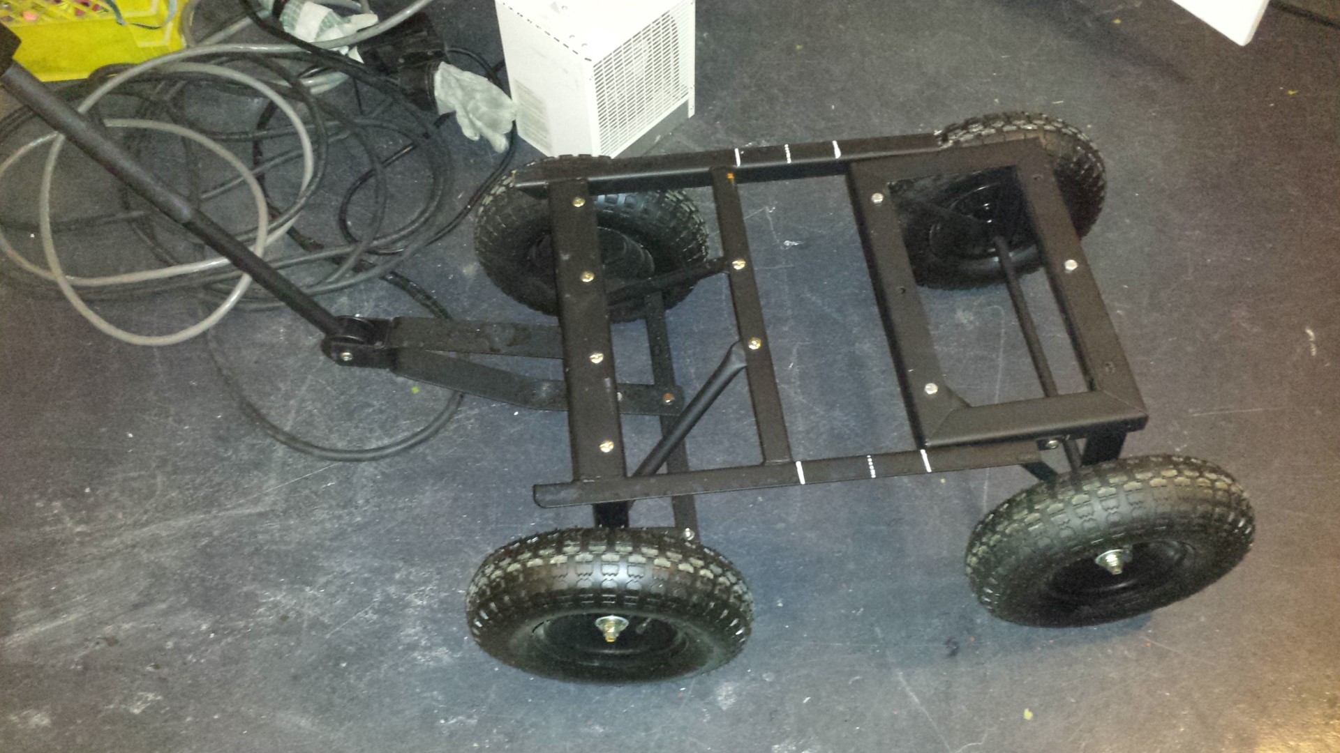Chassis: I used a Gorilla Carts 1200lb dump cart. I initially was going to build my own from scratch to suit the purpose, but this cart is $130 on amazon, and it's got all kinds of sticky details already figured out for you like ackerman steering, and the dumping bed (which I didn't think I wanted, but ended up taking advantage of). I did end up modifying this cart by lengthening it about a foot, but you could just build a smaller cart if you don't want to do this.