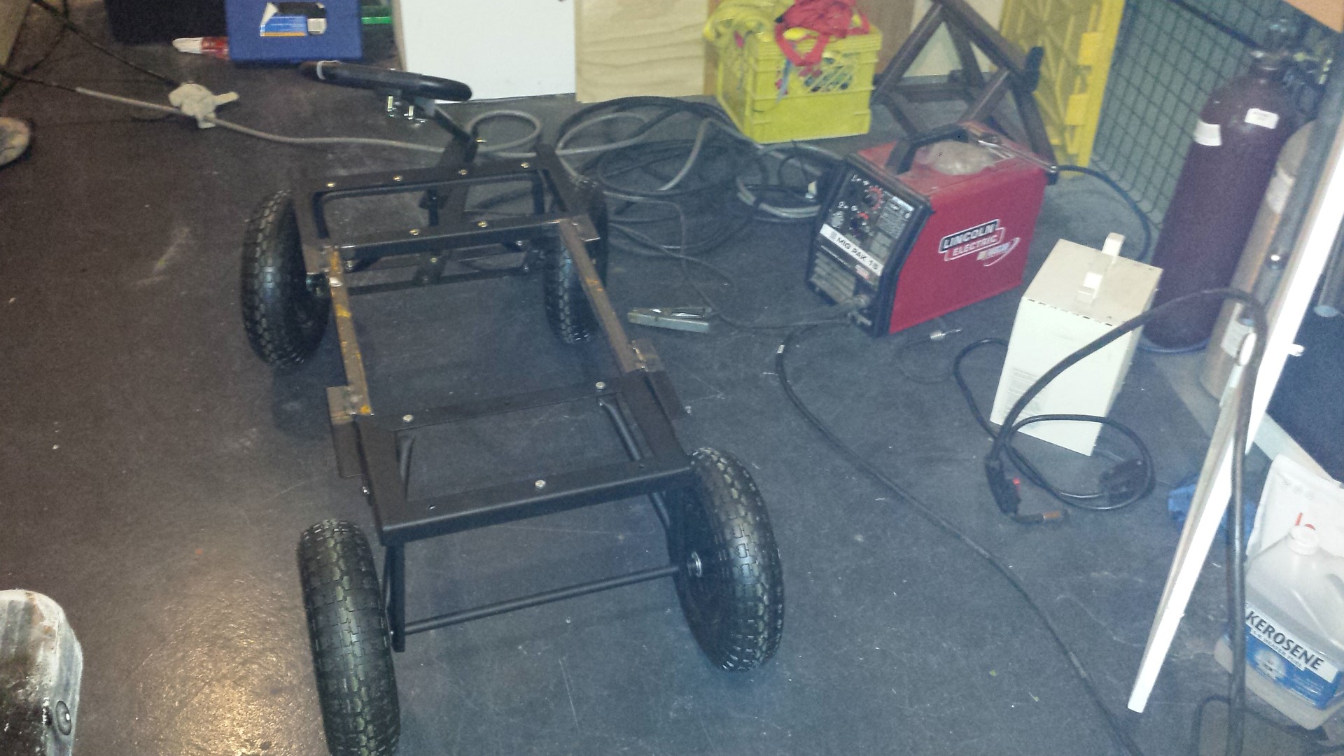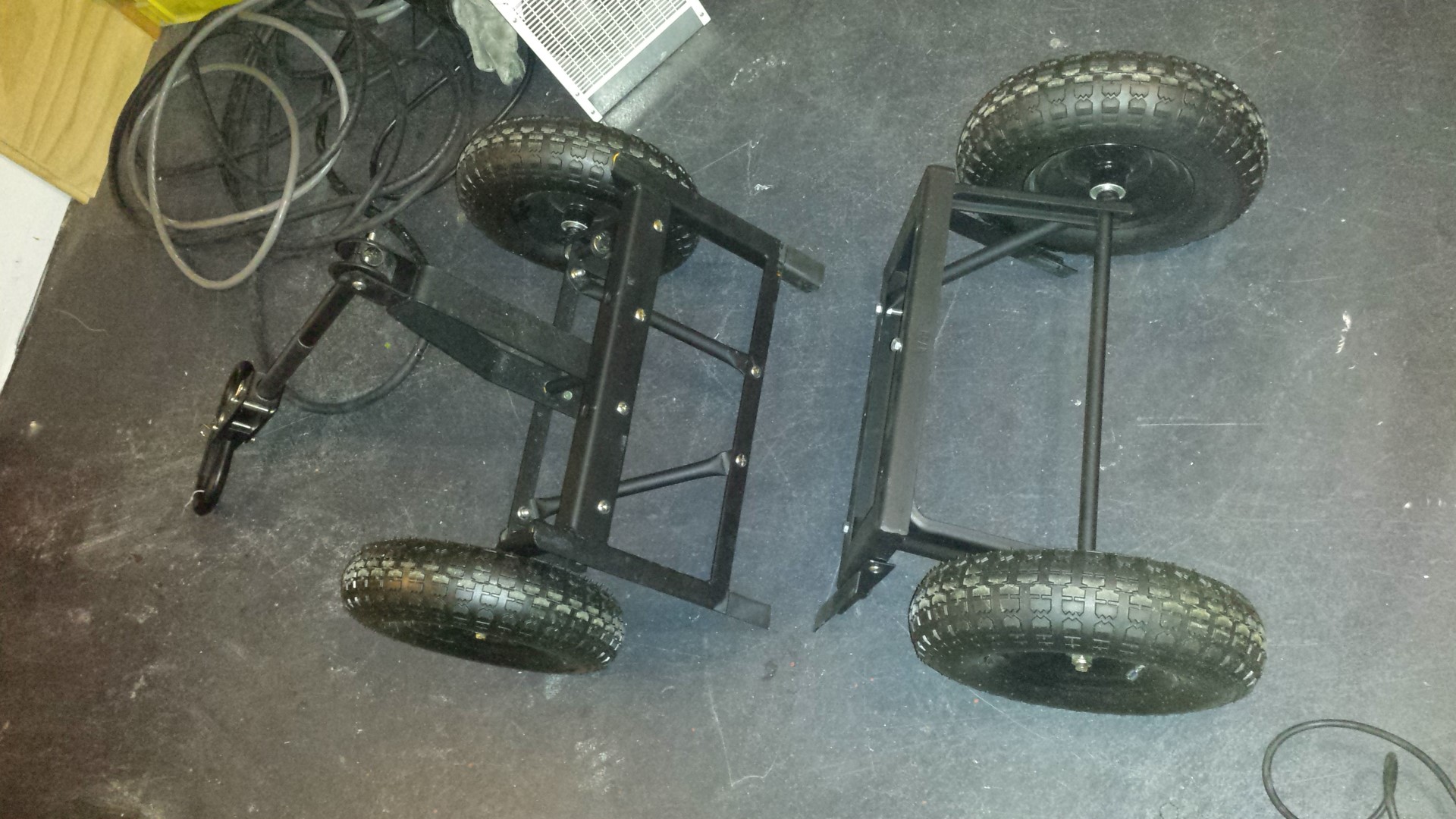 I really wanted to replace the back wheels with wheelchair motors. Some manufacturers of electric wheelchairs make their motor units a simple bolt-on block with a 10" tire already mounted to the motor shaft, so that building a drive train is as simple as making a bracket to bolt this unit to. Pairs of these are available on ebay from $60-$200. Add in a motor driver and a throttle and you could sit on the front of the cart and drive it, rather than pulling it around like a chump!