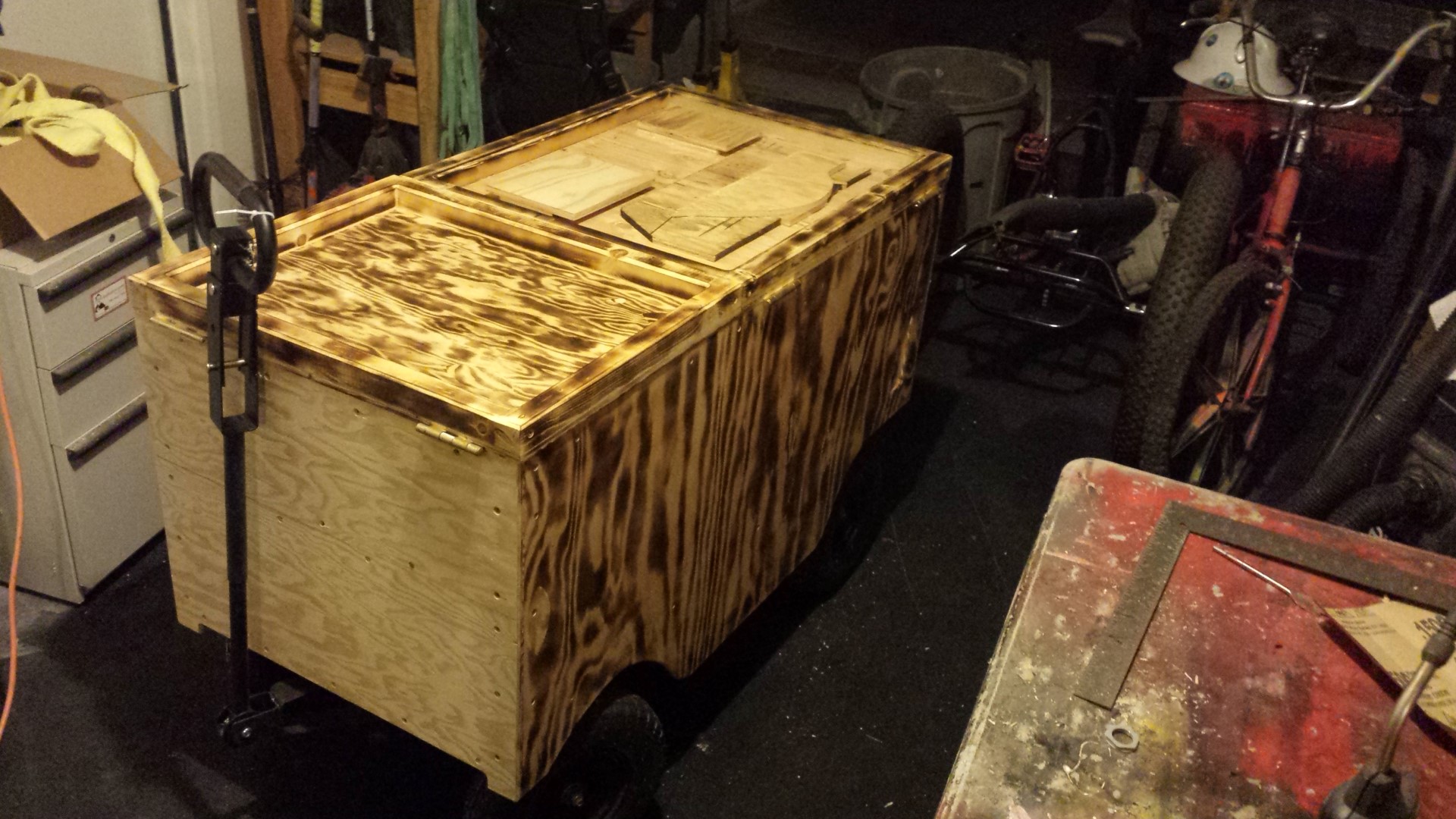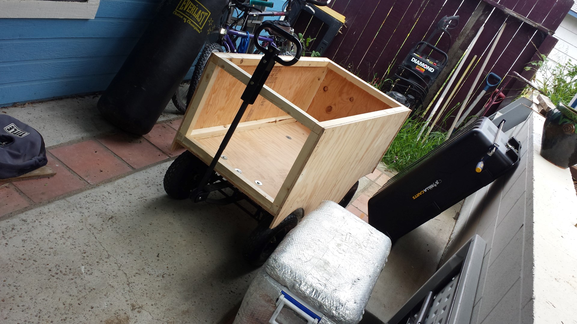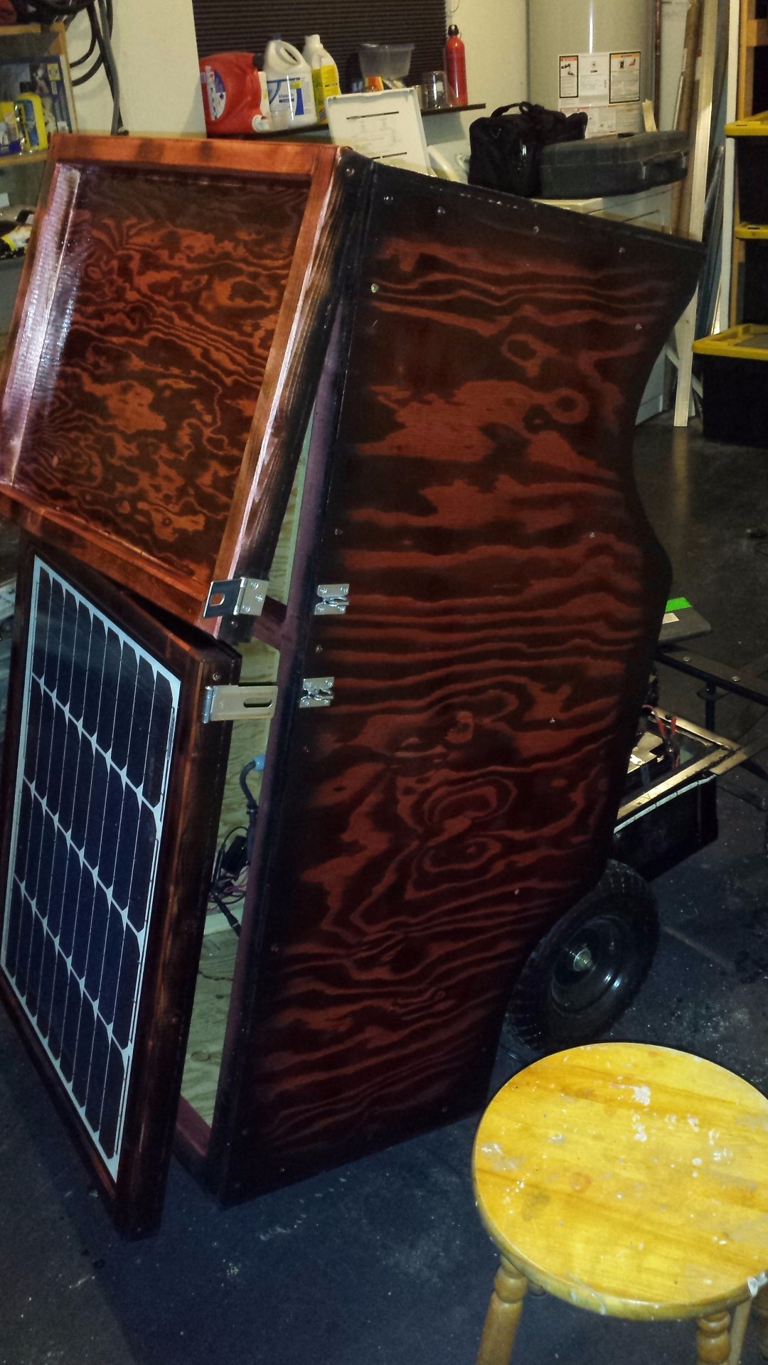 The bulk of my festival experience is at Burning Man, which is really quite a unique animal in many respects - not the least of which is you get to drive to your camping spot, complete with whatever trailer or monstrosity you can attach to your vehicle. It's also long, and big, and centered around creating huge and outlandish things... so I'm used to bringing a LOT of stuff to party with. In 2016 my wife bought us tickets to go to the Lucidiy-Crossroads festival, which is much smaller, was sold out of car camping passes, and would require us to haul everything we brought from the parking lot to our camping area. Clearly I needed to minimize what I was bringing; but I have some very cool festival toys that I really didn't want to leave behind. I needed a way to charge batteries, and haul my easy-up and some heavy, bulky costumes. I needed a secure place to lock up my electronics at night, and ideally it would look sweet and be fun to make.