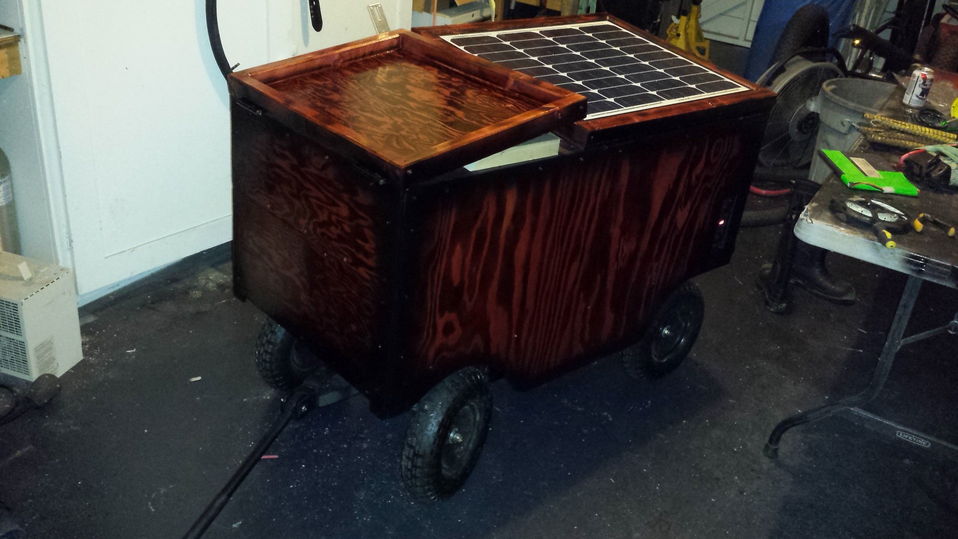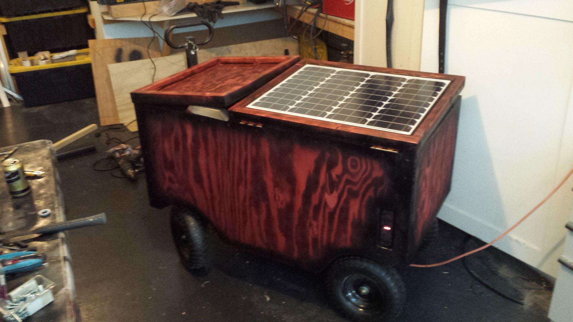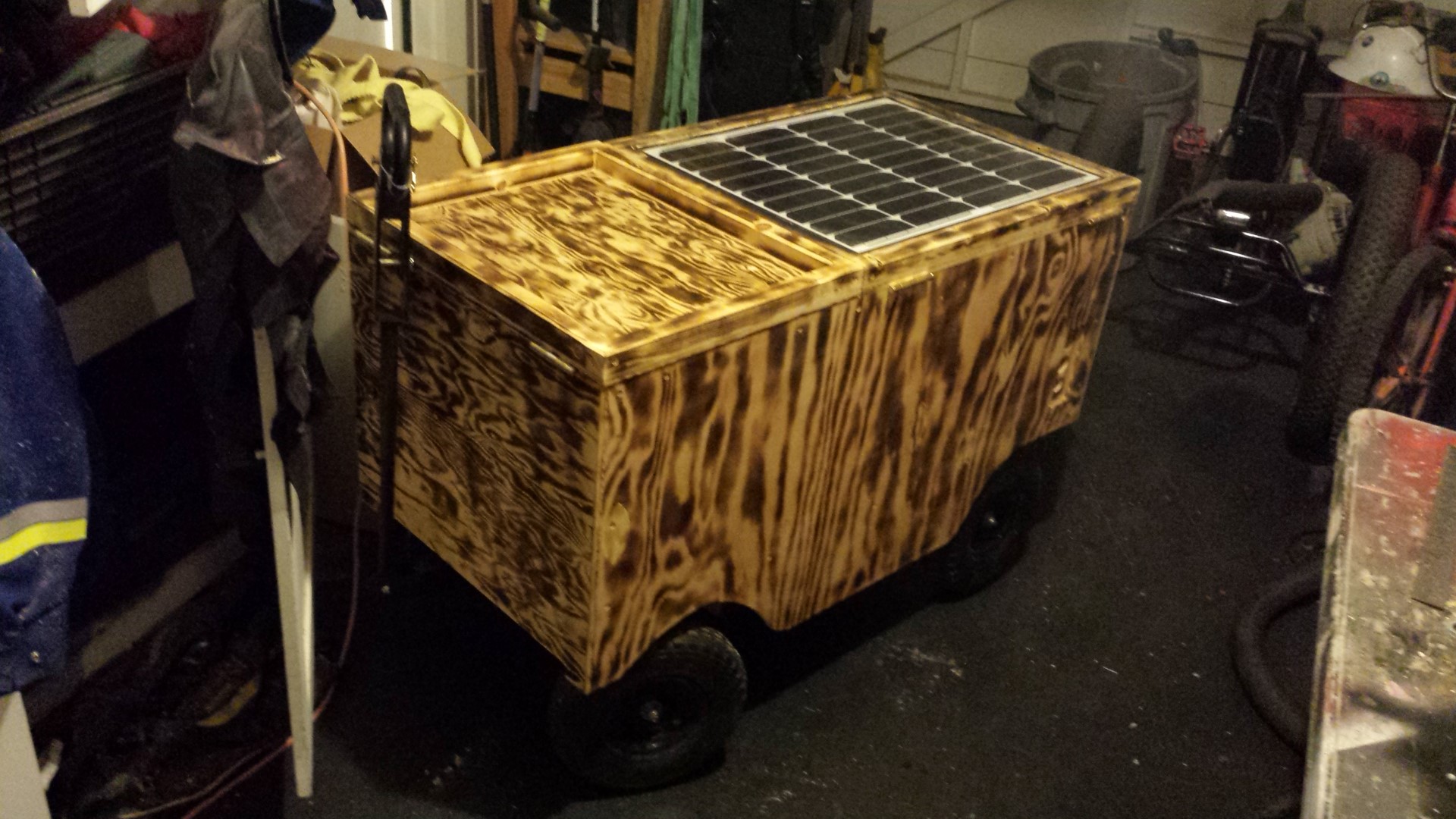 Enter the festival cart. This is basically a wagon that's been hitting the gym, and has some cyborg upgrades that currently include a solar panel, USB charger, Inverter, and a 12v lighter socket. Future plans are to upgrade with a wheelchair motor so it drives itself, but we'll cross that bridge when we get there.