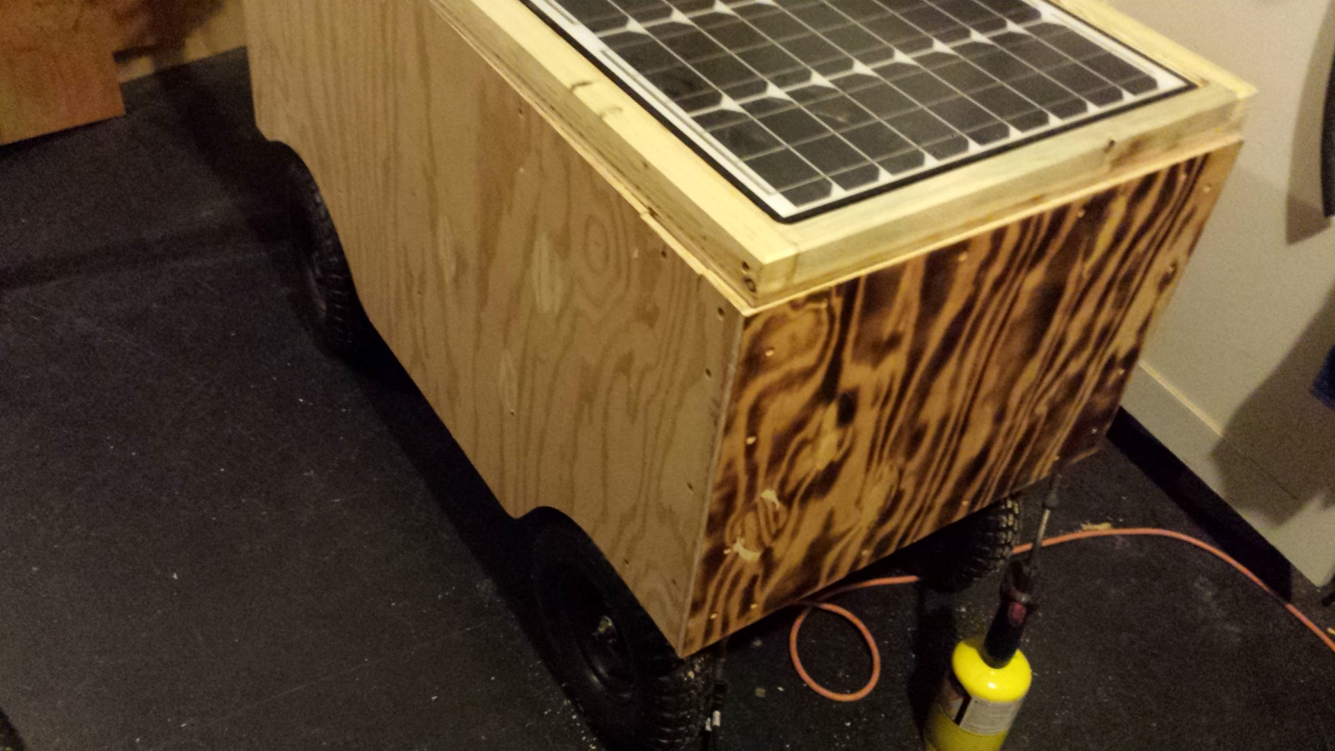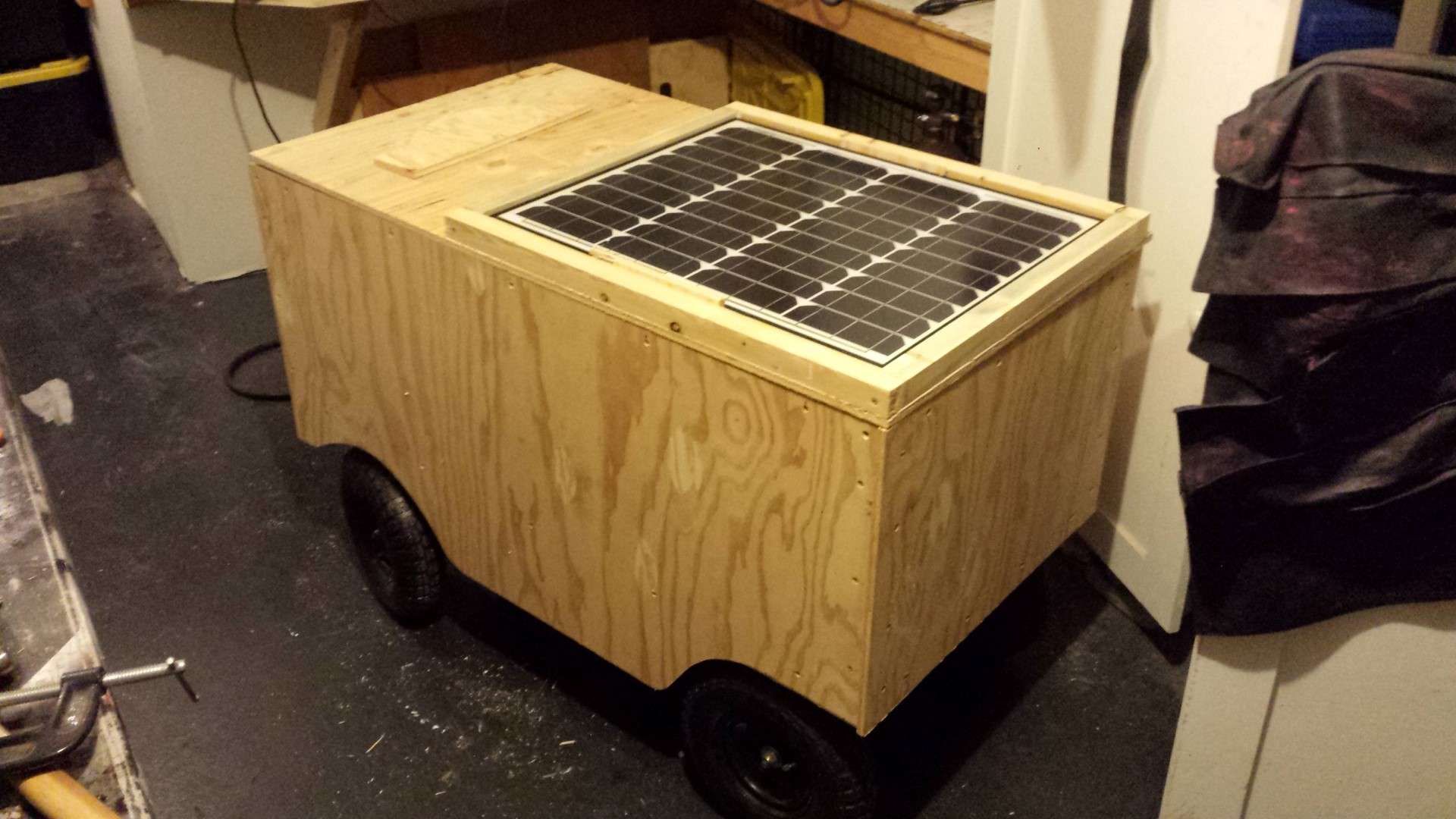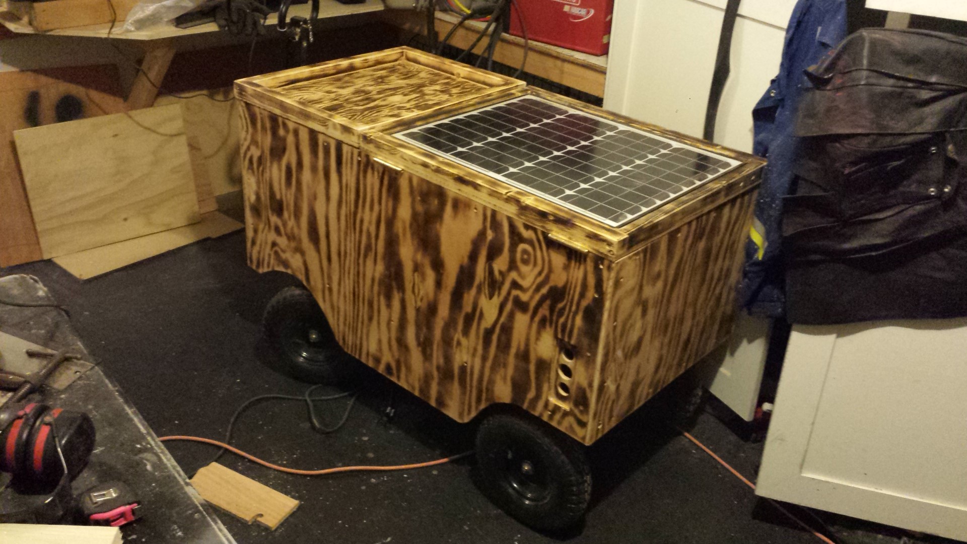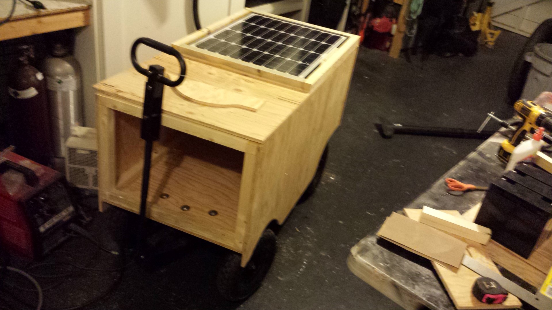 Enter the festival cart. This is basically a wagon that's been hitting the gym, and has some cyborg upgrades that currently include a solar panel, USB charger, Inverter, and a 12v lighter socket. Future plans are to upgrade with a wheelchair motor so it drives itself, but we'll cross that bridge when we get there.