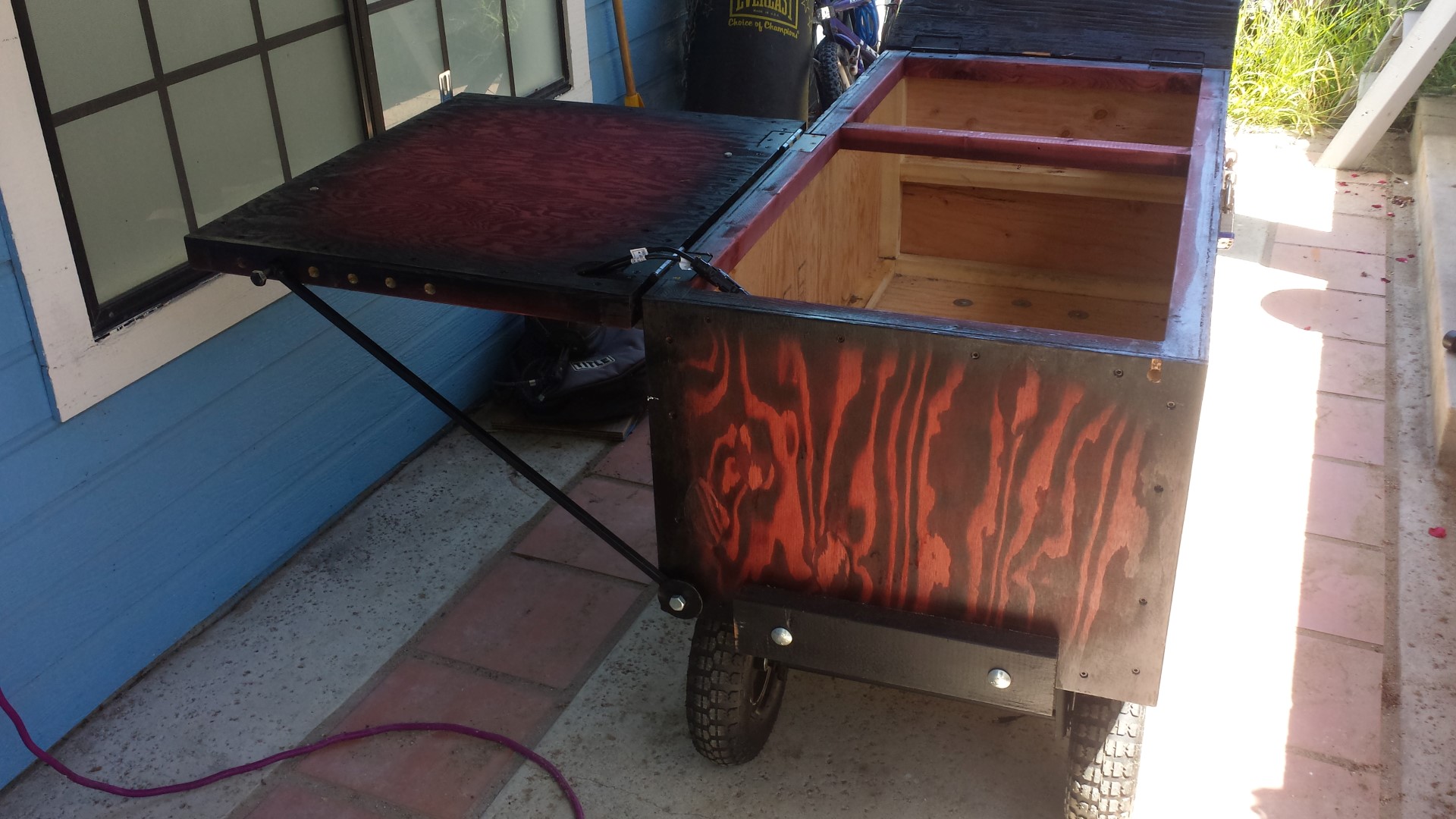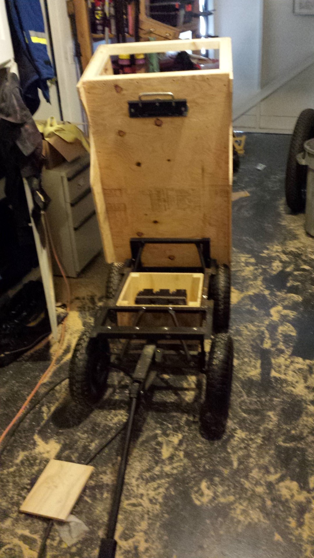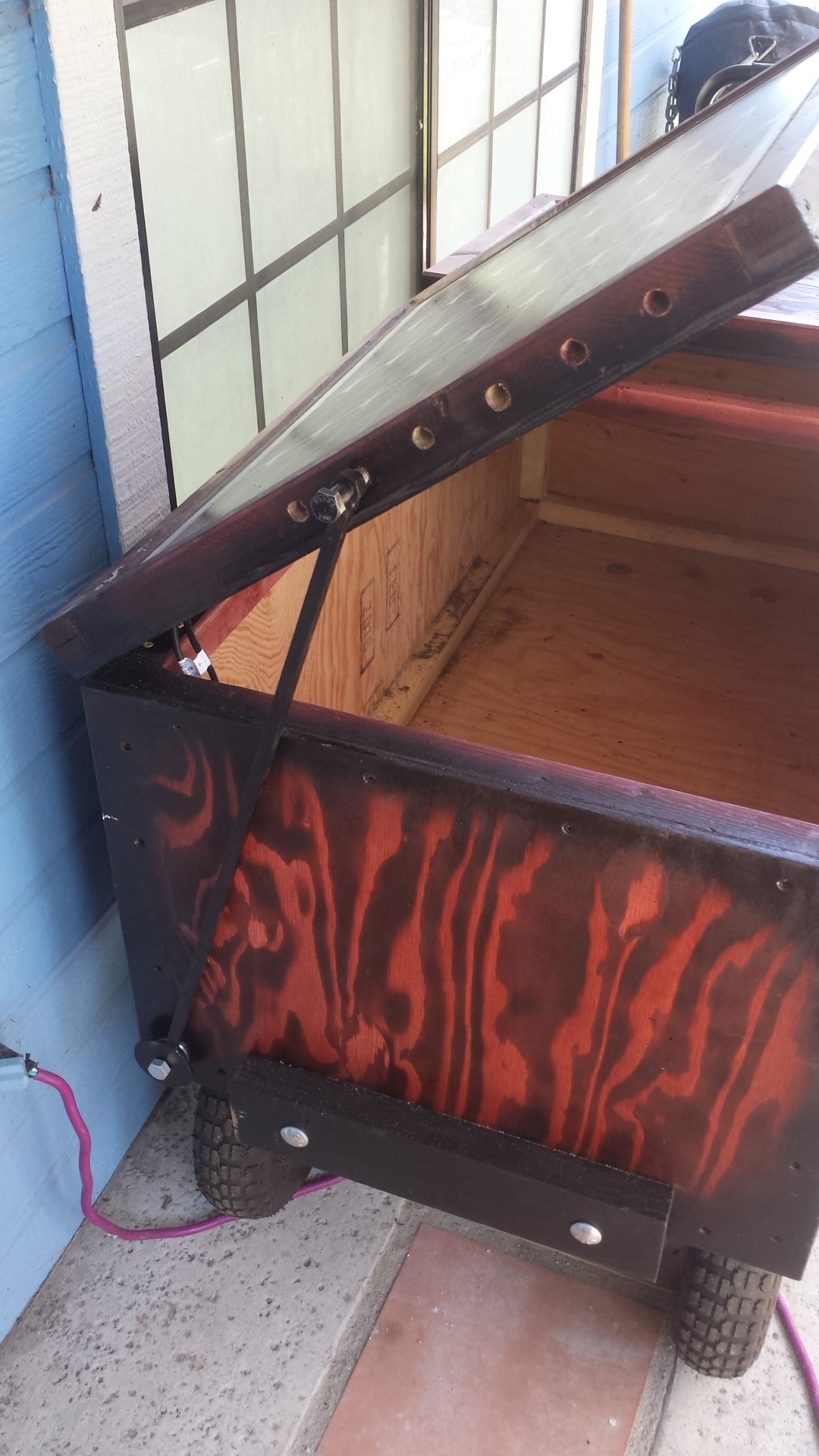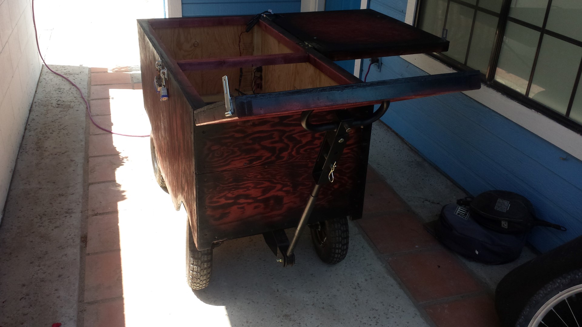 Box: I wanted an enclosed space I could lock at night to keep my battery chargers, lithium cells, camera, wallet, etc. in rather than just an open bedded wagon for hauling stuff. I made the box from 1/2" sanded pine plywood and 2x2 studs from home depot.