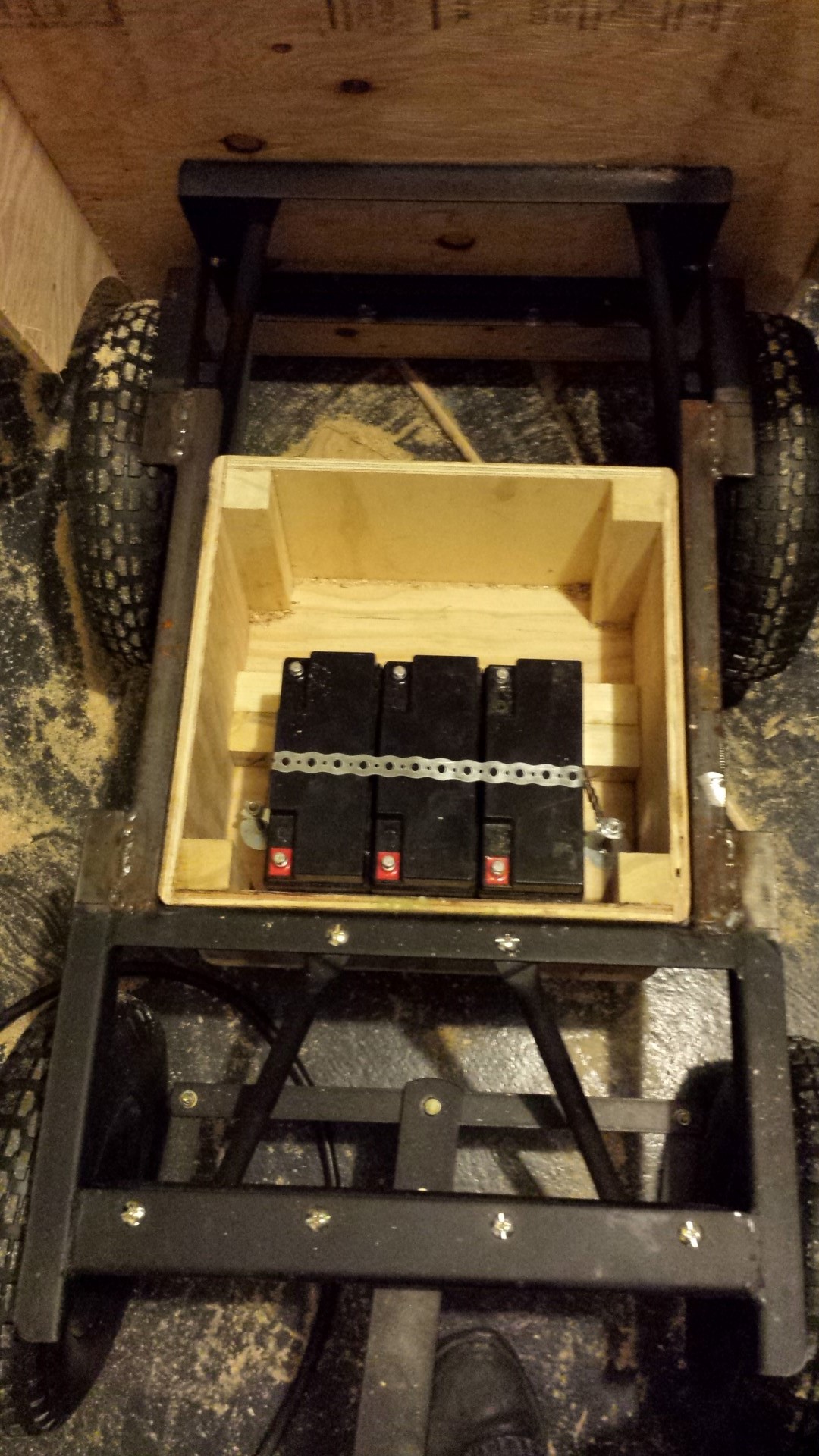 Note: It's not shown in any of the photos, but I bent some steel straps into brackets to support the bottom of the box. These batteries are heavy and I didn't want to take any risks, so I welded these straps to the frame where they go down around the bottom of the box and back up and are fastened to the wood with screws.