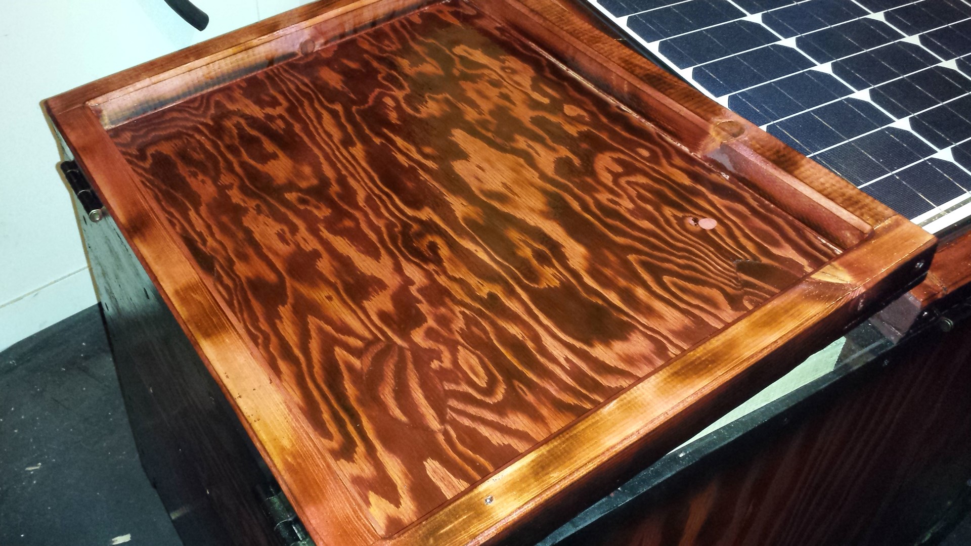 As an added protective feature, I stacked scraps of wood under the solar panel to snugly fill the air space between the lid and the back of the PV cells. I did this so that if someone puts a heavy object (like a human derriere) on top of the glass, there will be some support underneath instead of the full load going on the thin glass.