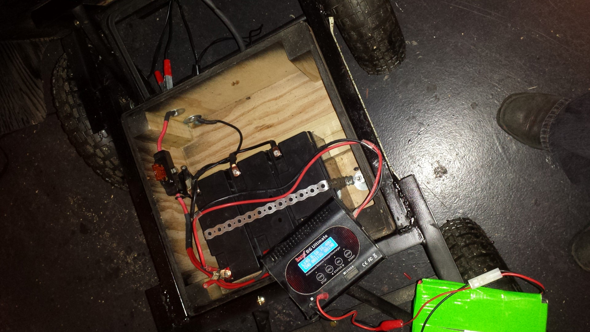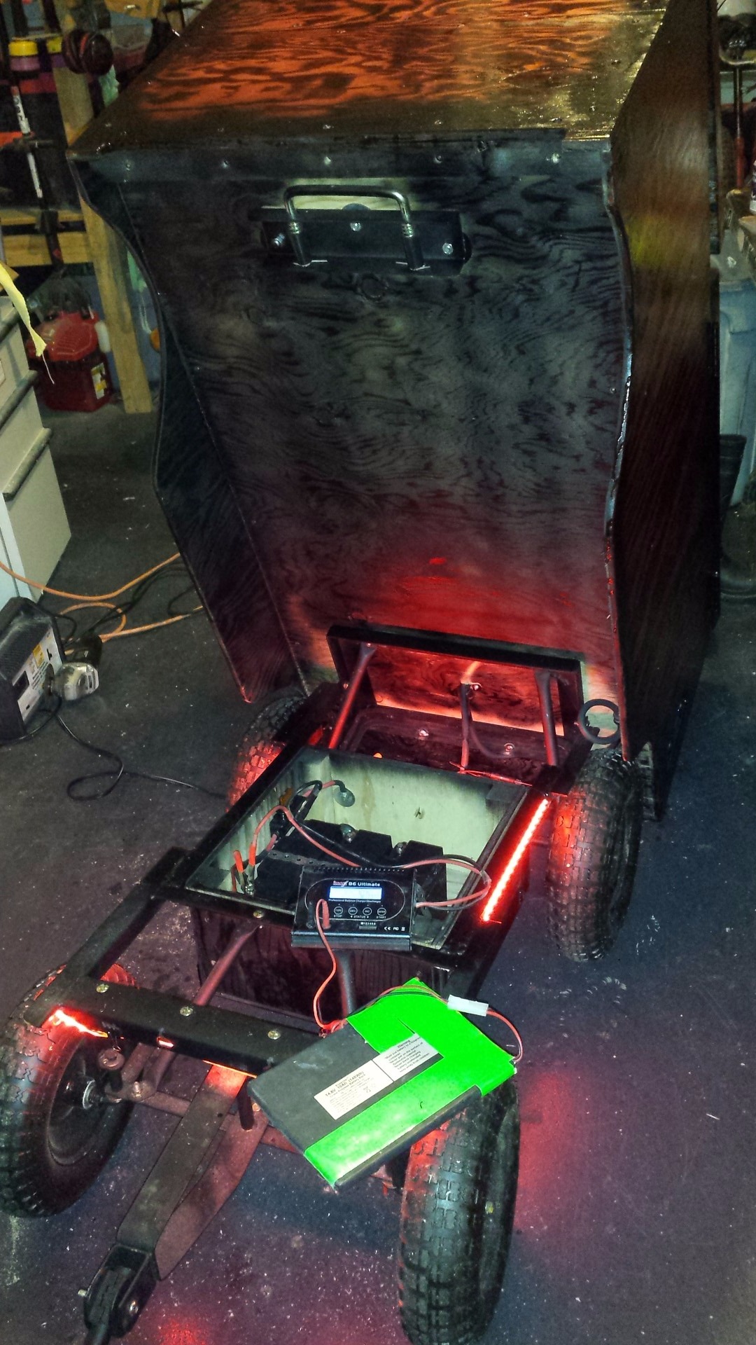 Batteries: One of the main functions of my cart was to provide power to charge my phone, camera, and the batteries for some of my other frivolous toys like my 75w led coat (instructable to come). As such I needed some pretty decent batteries. Weight not being a major concern, I went with sealed lead acid batteries designed to power electric wheelchairs. These are WAY cheaper online than in a mobility store - mine were $40 each from amazon for 20Ah cells, and I went with three of them (though there's room to expand later).