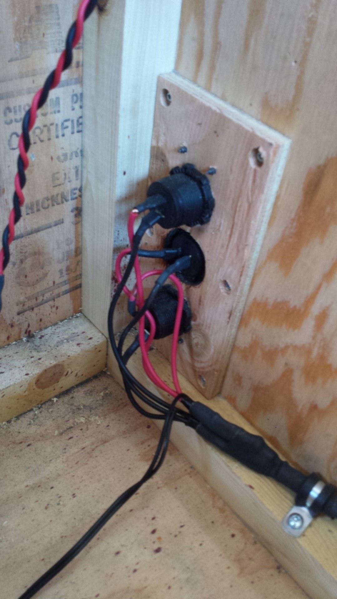 Power Outlet: The outlet I used is a 3 in 1 unit with a slick voltage readout, 2x 5v USB charger outlets, and 1x 12V lighter socket, available here. To mount the outlet, I actually recessed it by making a cutout slightly larger than the outlet bezel, and then glued another piece of plywood to the inside. This protects the outlet a bit, and saves me the frustration of getting it caught on things. Also I'll admit here that I screwed up the original cutout for the sockets to go through, and so I had to do this to make it work - but it worked out better this way anyway so - serendipitous sweetness.
