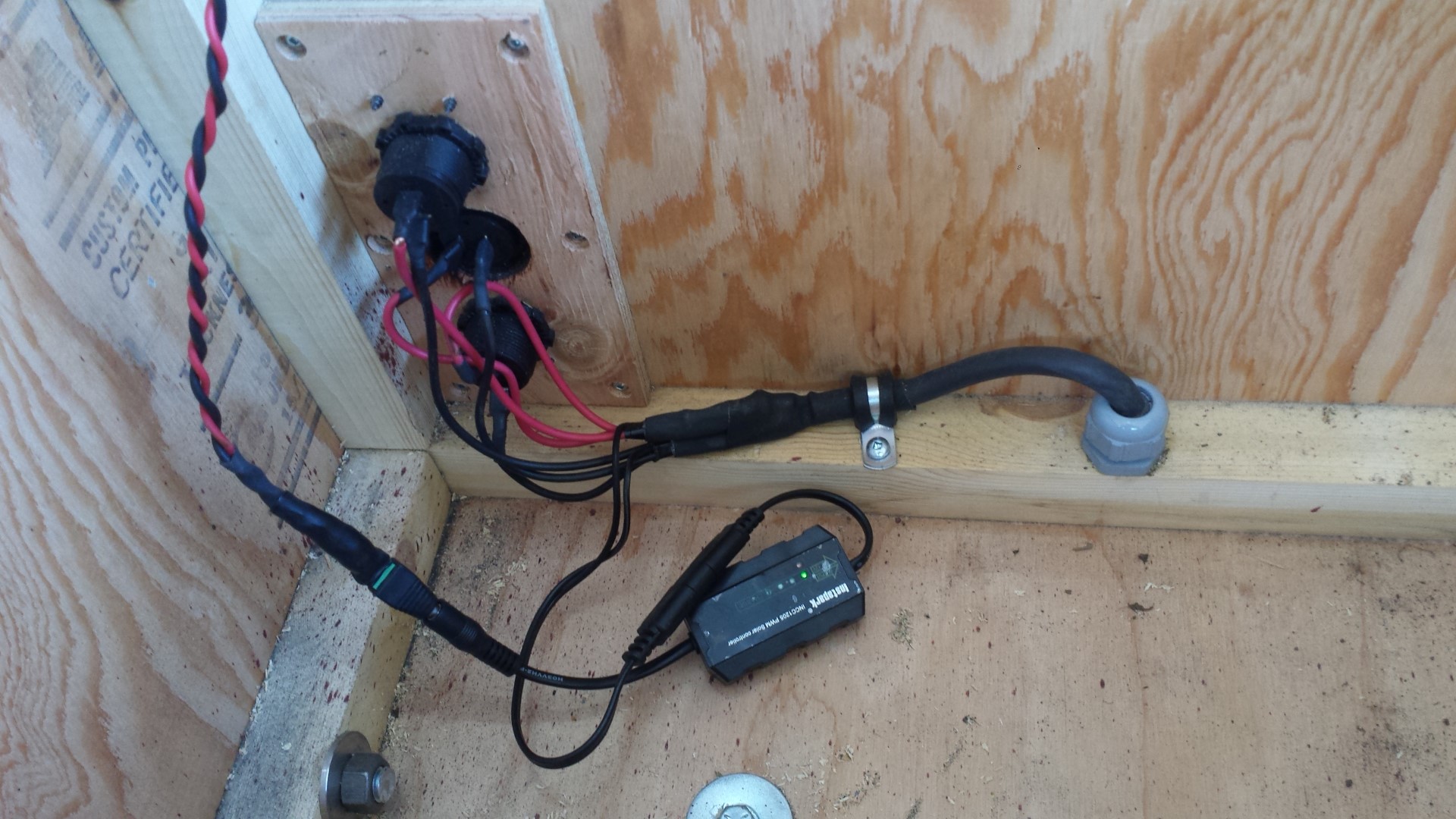 Mounting Solar Panel: The solar panel turned out to be exactly the right size to be framed in by 2x2's, which provides a nice bit of extra protection for it. I used a 2" hole saw to make a hole for the wires to drop into the box (make sure the hole is near the hinge side of the lid, so the wires don't get in the way when you open the lid). To hold the panel down, I clipped 1/4" UNC U-nuts over the aluminum frame of the panel where there were already mounting holes drilled. I then carefully pushed the panel into place, pulling the wires through, and screwed 1/4-20 bolts in from the underside (obviously after drilling holes for them).