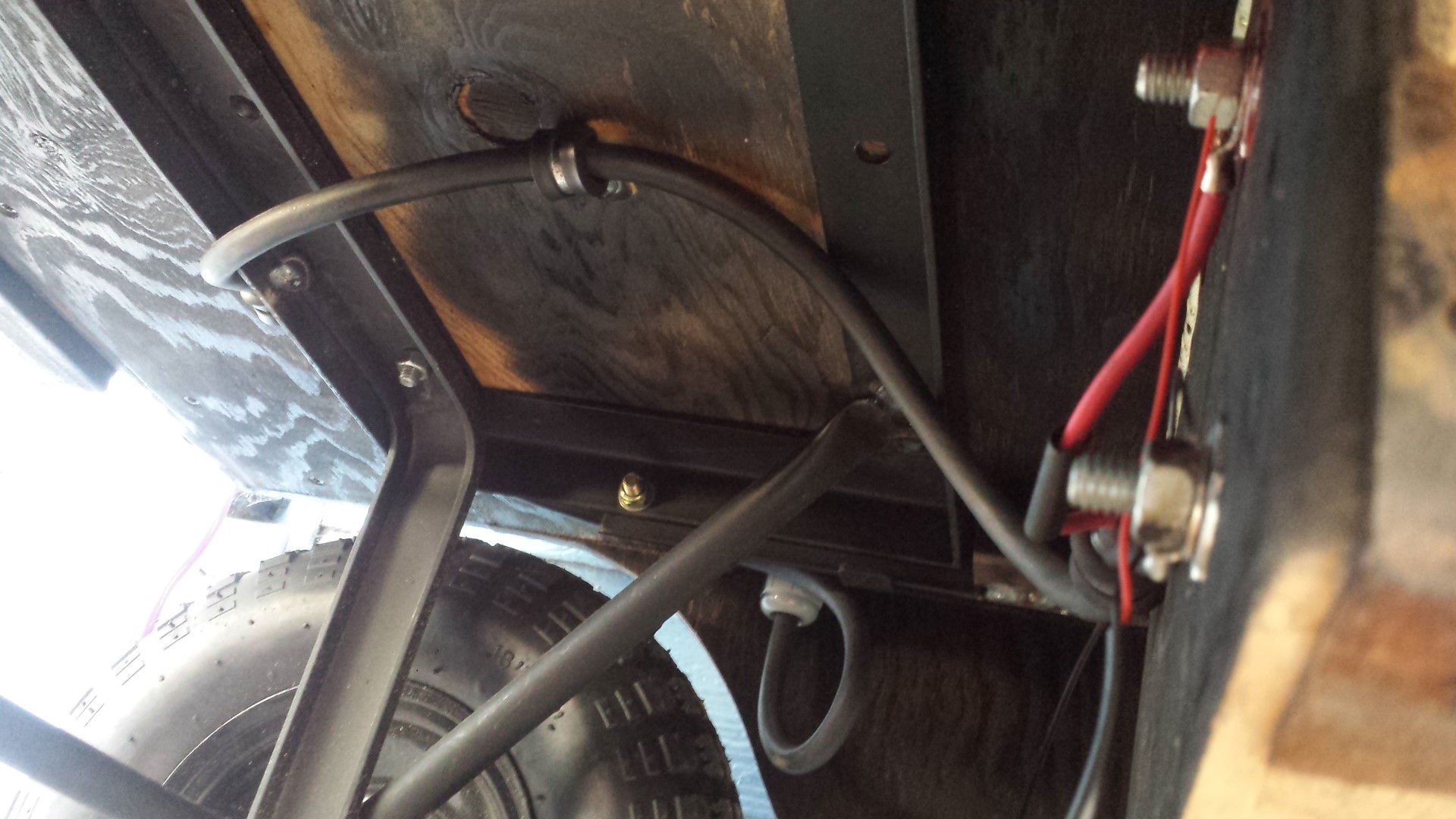 Now, the trick here is ye olde dump mechanism. There is relative movement between the main box and the battery box when the dump mechanism is used, so I had to run the wires where they wouldn't get pinched, stretched, or otherwise messed up. The way I did this was to run the wires out the bottom, and along the underside of the floor, looping around to fasten them in the middle of the sub-frame. All these pieces are bolted together and do not move relative to one another, so we're fine so far. The reason for the weird routing was to get to a point that only moved a little bit when the dump mechanism is used. This point on the floor moves the least with respect to the battery box, and so it was the ideal place to fasten the wiring to the box before it makes the free air leap over to the battery terminals.