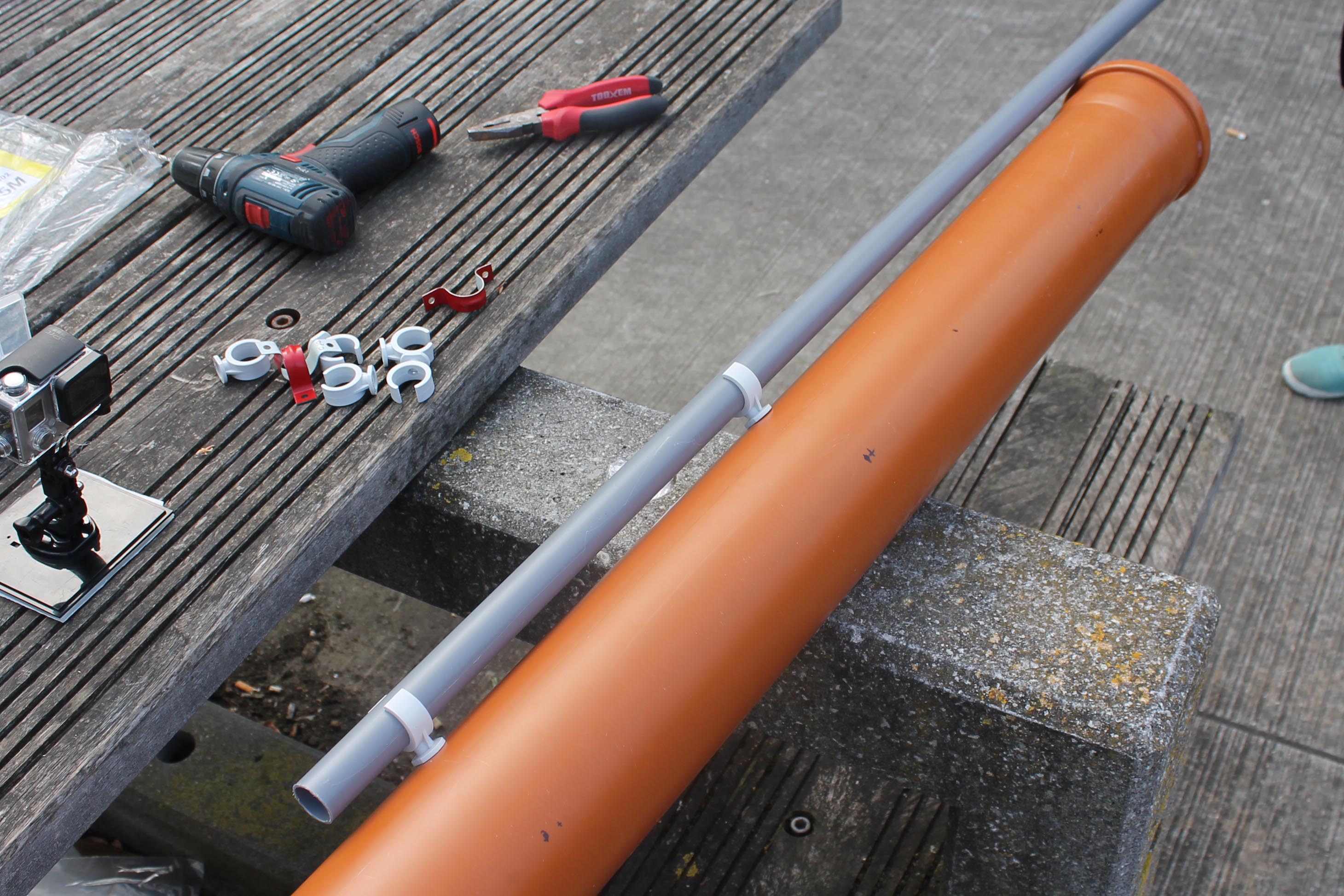 Connect the 4 pipes by putting tension straps through the 8 holes at 50cm from the start. This will keep the pipes from turning around too much. Also attach metal straps around the pipes for extra strength / safety.