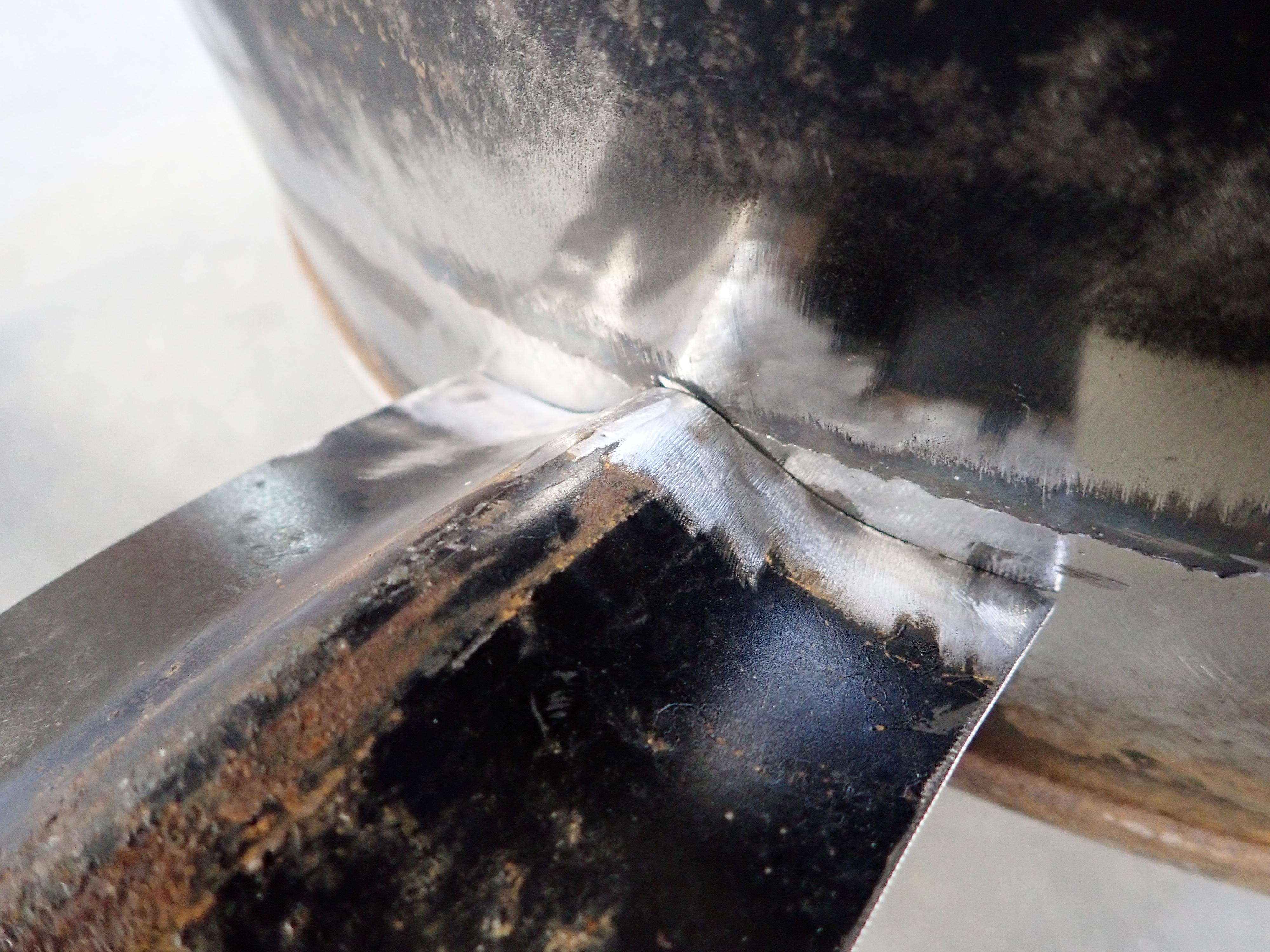 After there was a continuous joint all around, I ground the weld down with an angle grinder. This revealed how wavy my joint actually was (last photo). I'm okay with that, as I'm just learning and this is for fun.