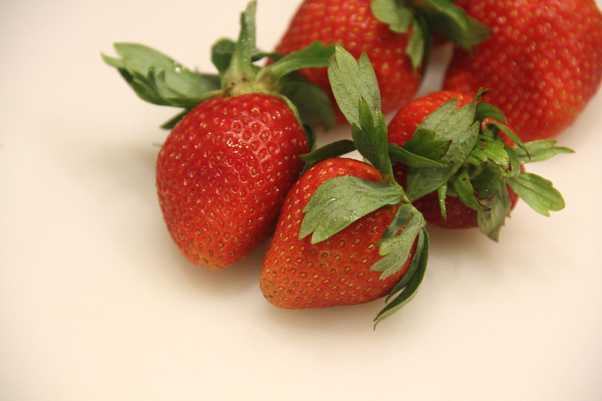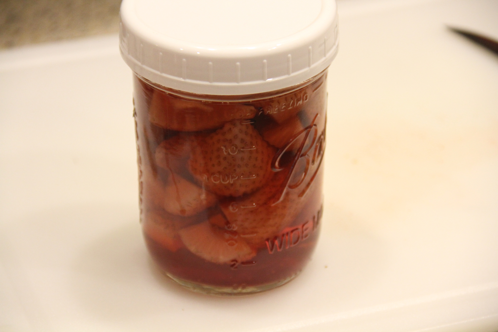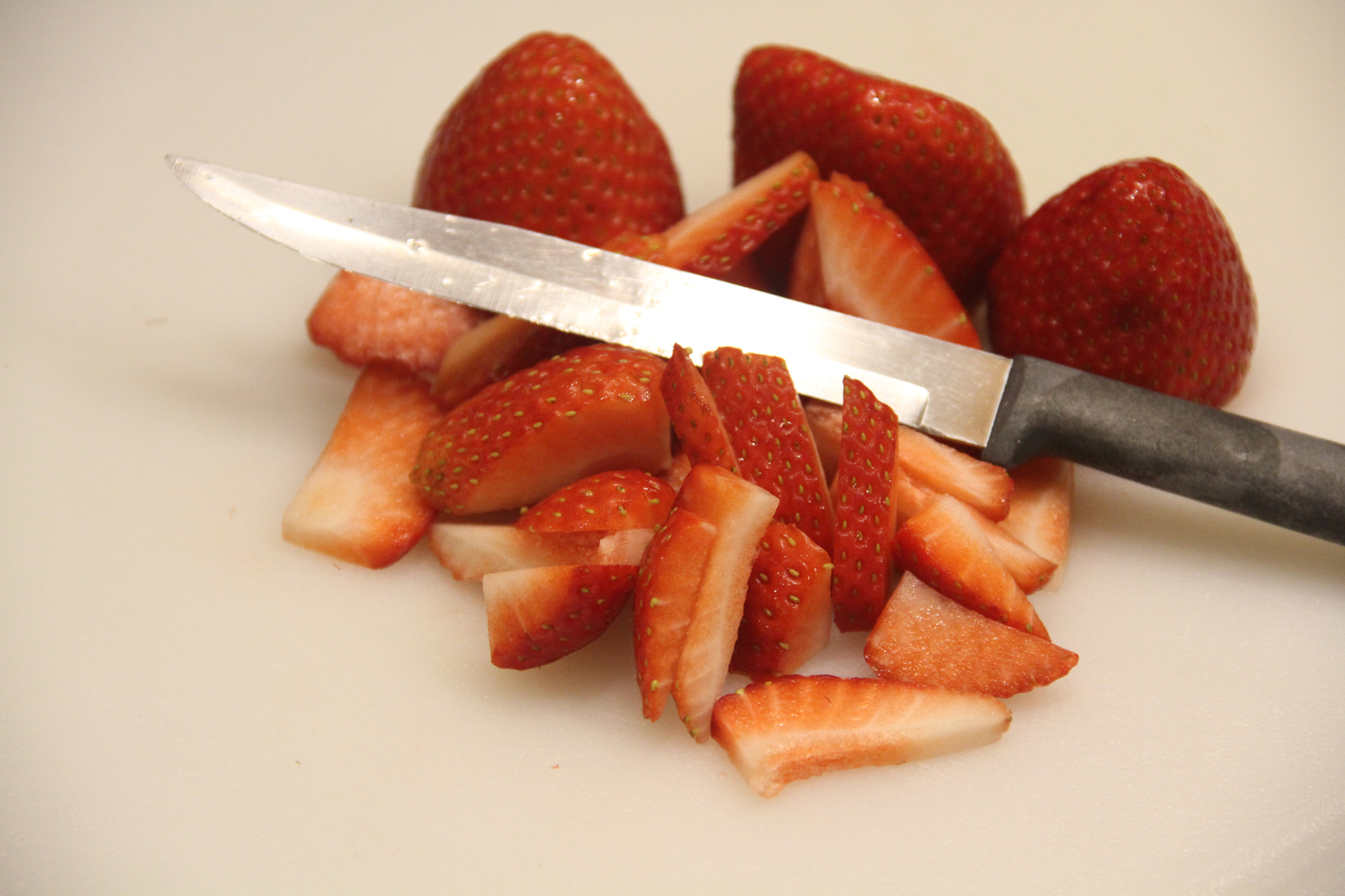 Whether you cut your berries or fruit up will depend on the fruit. Smaller things like blueberries or tart cherries you'd likely leave whole. I cut these strawberries up to try to pack more into the jar.