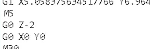 - At the very end of the script, after the final M5 command, we want to move the Z axis so that it is above our final print. Since I set my print height to be -1, I’m going to set the final Z axis height to be -2 (G0 Z-2)