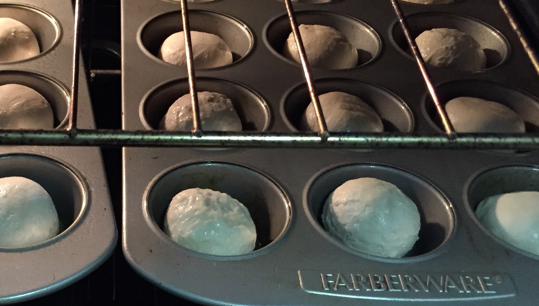 Pre-heat oven to 200 degrees, boil around 2 quarts of water, Spray non-stick cooking spray into 24 muffin tins and place the frozen dough balls in each one. Once the oven is preheated turn it off. Pour boiling water in a shallow pan and put it on the lowest rack in the oven. Place the muffin tins in the oven on the rack just above the boiling water. Leave dough in the over for about 90 minutes, the dough balls should double in size.