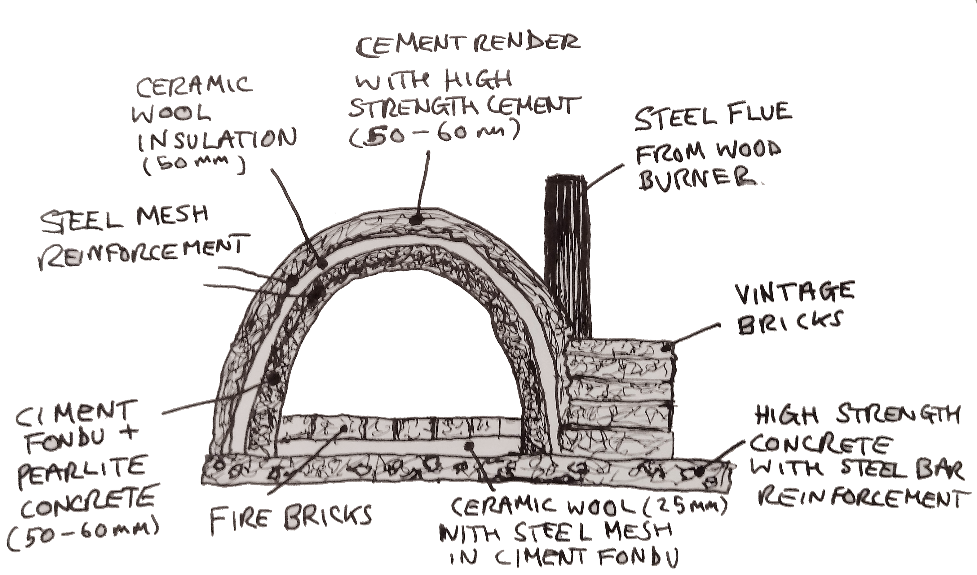 - the cooking chamber needs to be heat-proof (duh!), but it was not that obvious in advance, which common building materials are actually heat-proof (e.g. basic cement-based concrete can break down if the oven temperature goes above a certain level), so take care looking at your choice of cement in particular