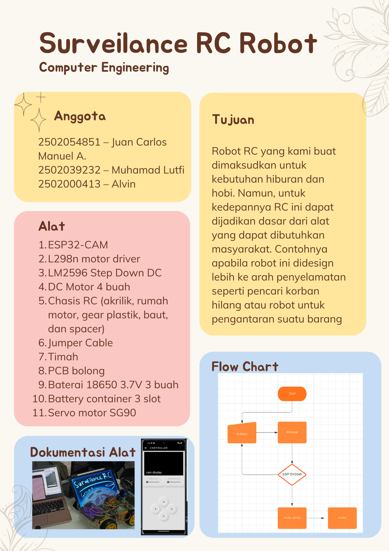 Alat ini adalah alat berbasis IoT yang merupakan robot rc yang menggunakan mikro kontroler ESP32-CAM dikontrol dengan aplikasi. Alat ini bertujuan untuk hiburan dan mengembangkan hobi. Tentu dengan berbagai mantainance alat ini akan dapat digunakan sebagai alat yang berfungsi untuk masyarakat seperti robot pencarian korban, robot pengantar barang, dan lain-lain. Kami menggunakan aplikasi untuk mengontrol alat ini dengan firebase sebagai database penerima dan pengirim sinyal dari esp.