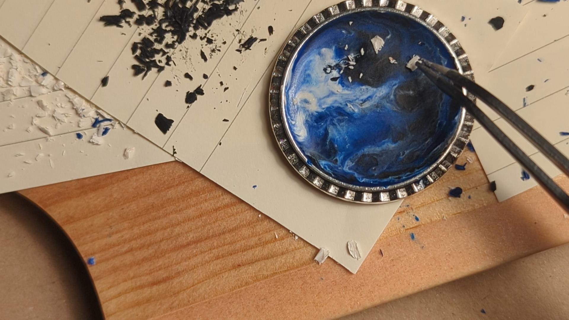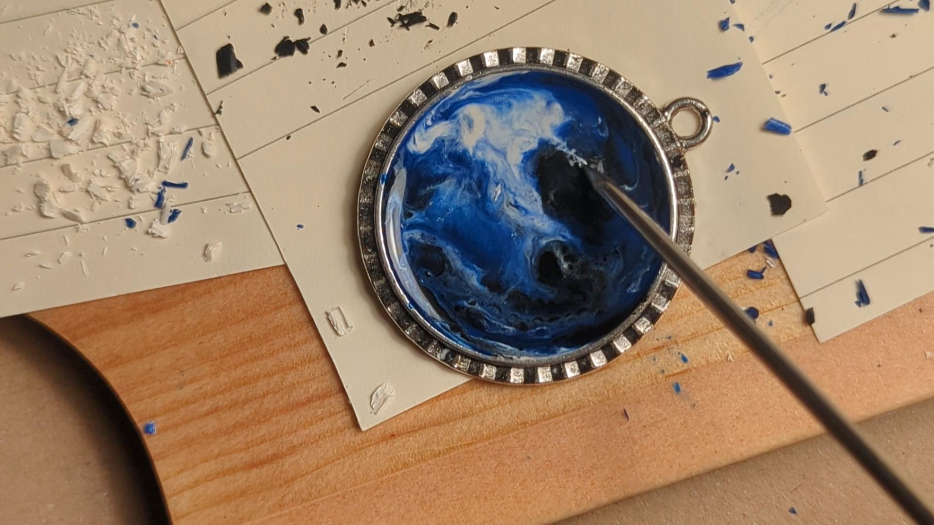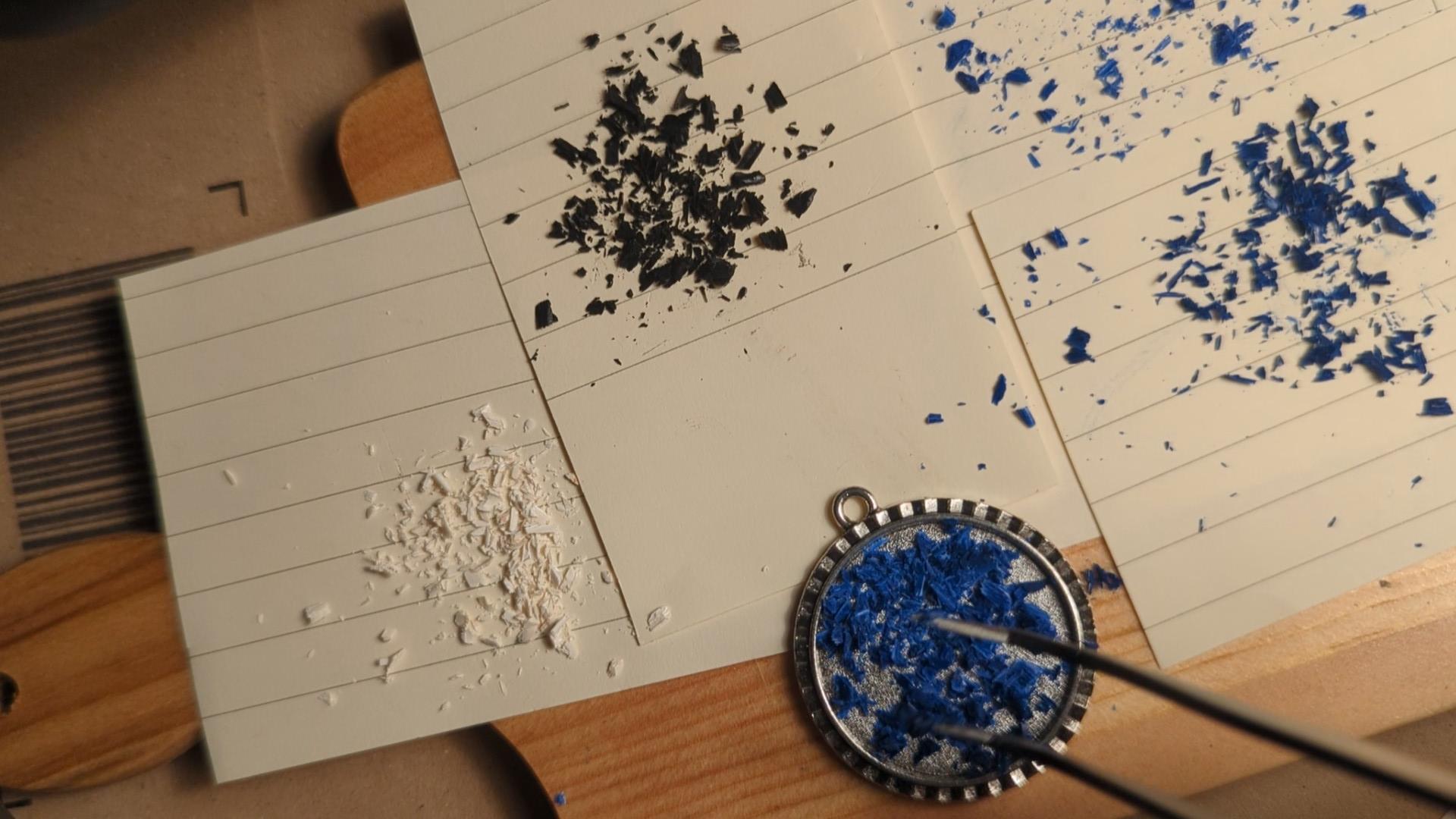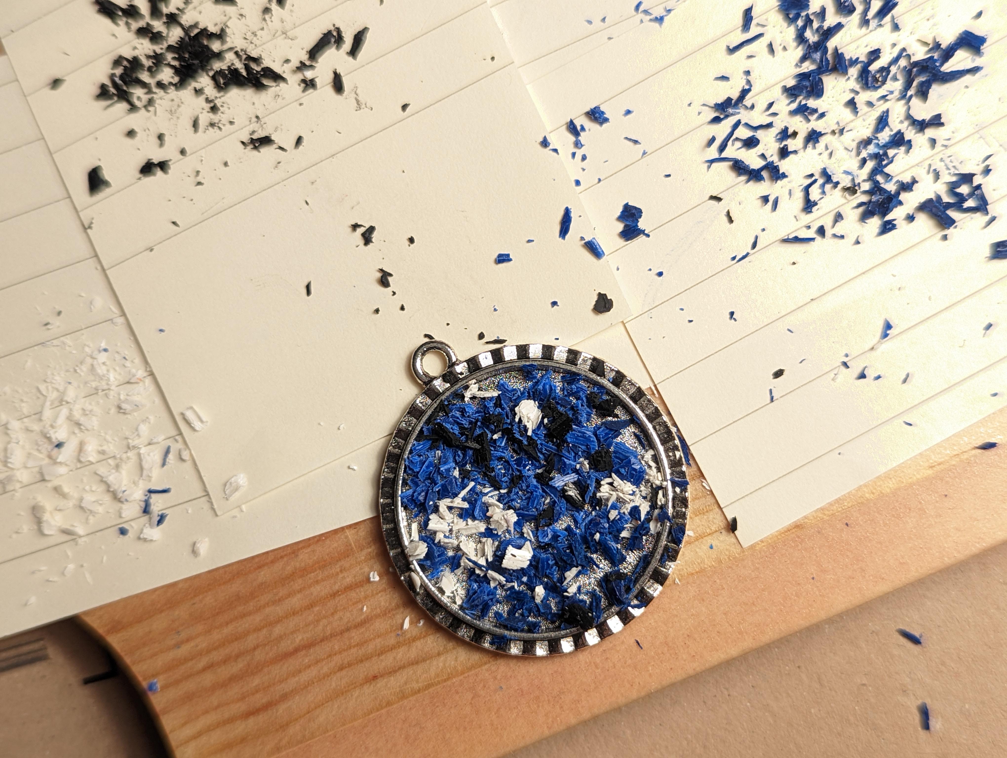 Use your fingers or some sort of tool, like tweezers to fill the empty pendant with shavings, arrange them in a desired pattern and gently transfer onto a baking tray.