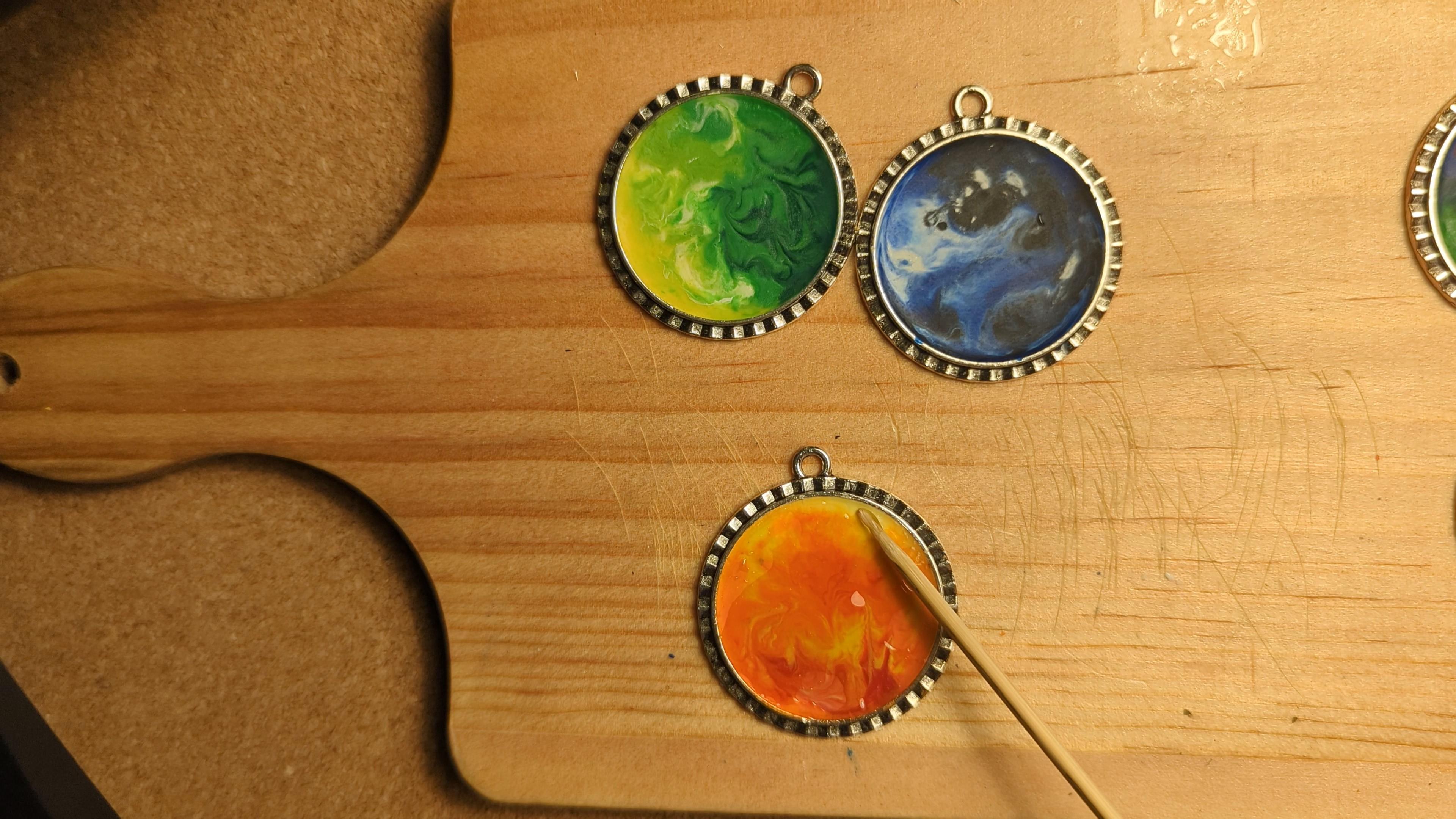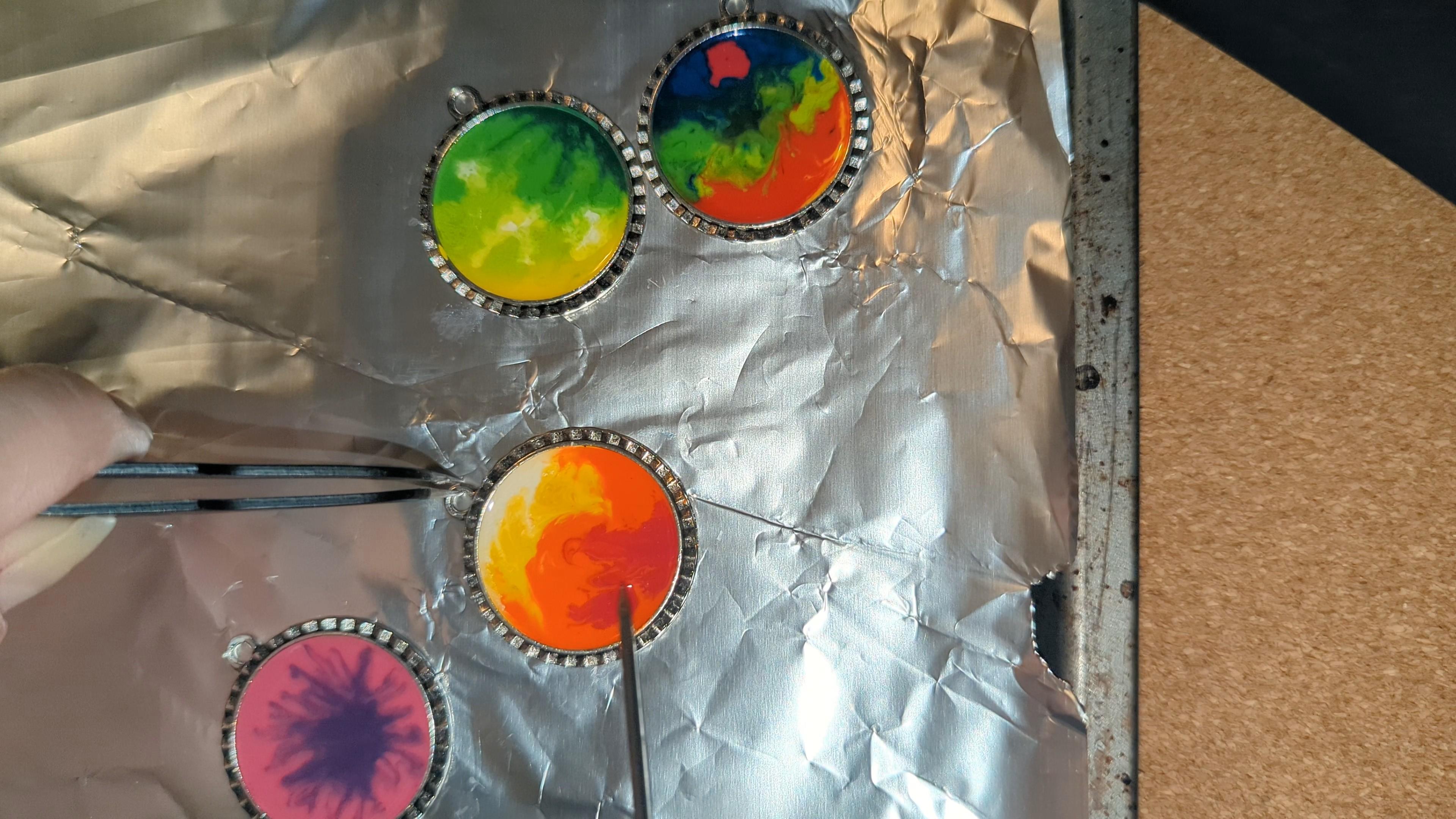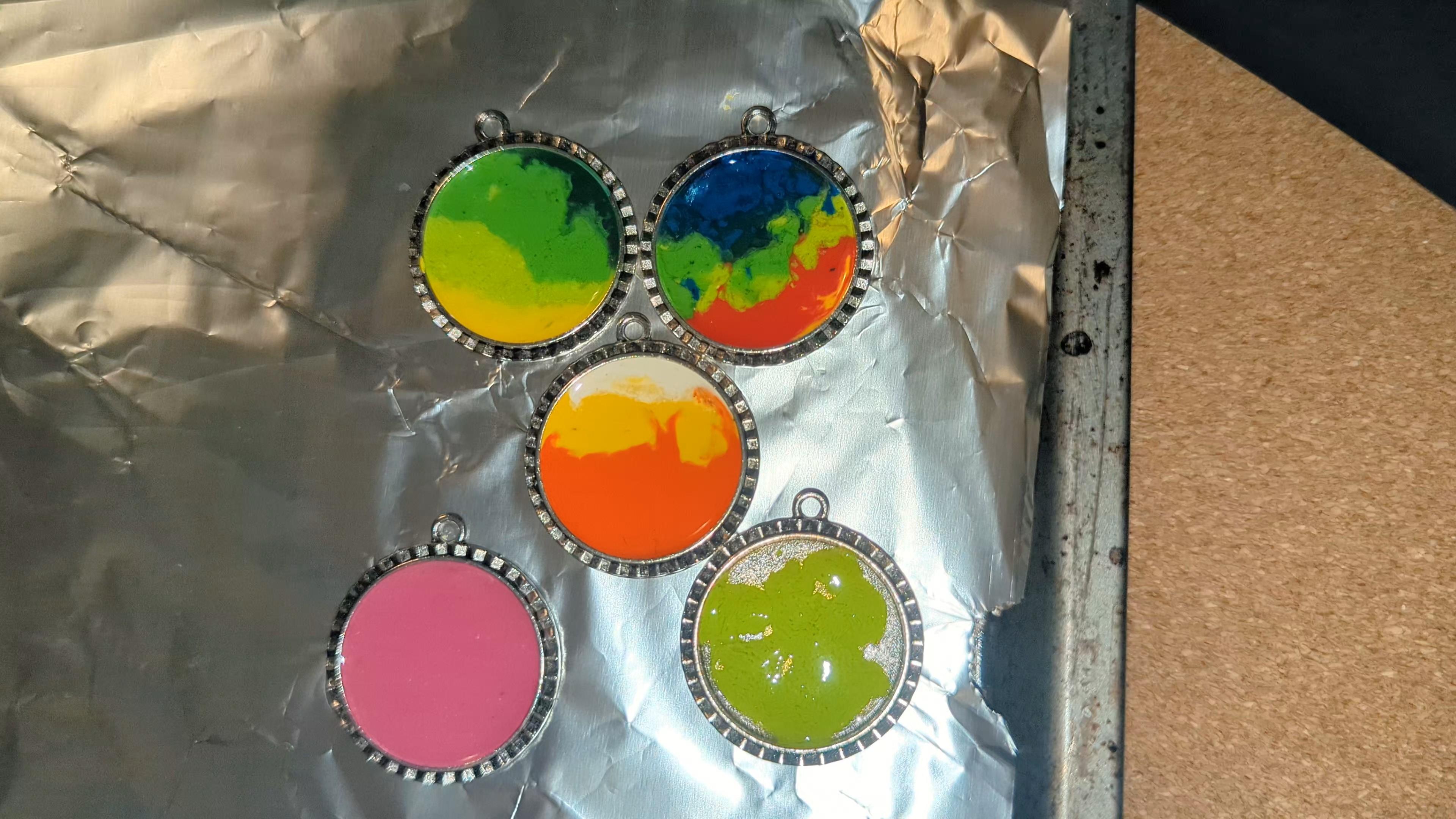 Put the tray with your pendants in the oven at 300°F and 'bake' until crayons are all melted. It takes 20-40 seconds usually, so keep an eye on them and take them out as soon as they are liquified. Some crayons can burn if left in the oven too long.