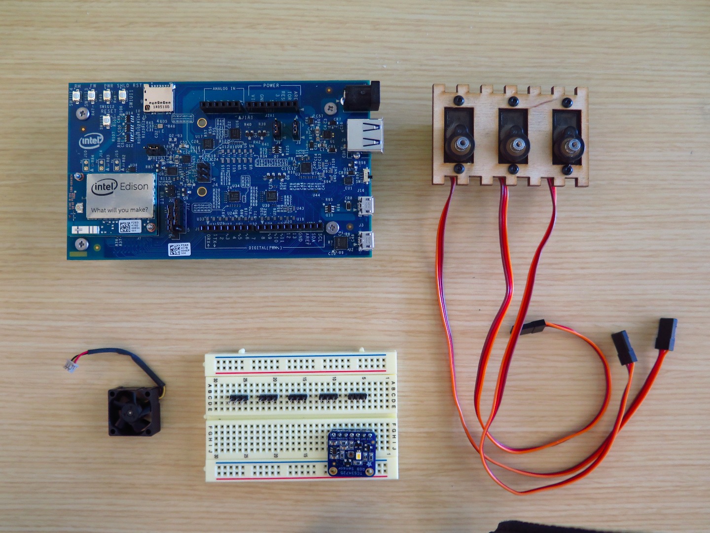 Next are the servos which have three wires coming out of them which are power (V+), Ground (GND) and Signal (SIG). The PWM (Pulse Width Modulation) signal that drives the servos is a generated by the Intel Edison from only a few special pins. Here we Intel provides awesome getting started and maker support forums if you need guidance along the way. I referenced the Edison hardware design files multiples times through this build.