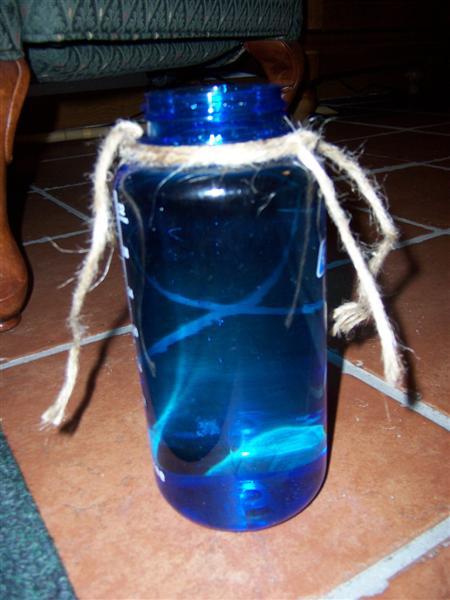Take two lengths of jute twine one about 1.5 feet the other about 3 feet. Tie the 3 foot piece around the neck of the bottle in a tight square knot leaving plenty of extra on both sides. Second take the other piece and tie it around the body (fat part) of the bottle (only) as tight as you can again end in a square knot sorry no picture. Remove this piece from the bottle and continue to the next step.