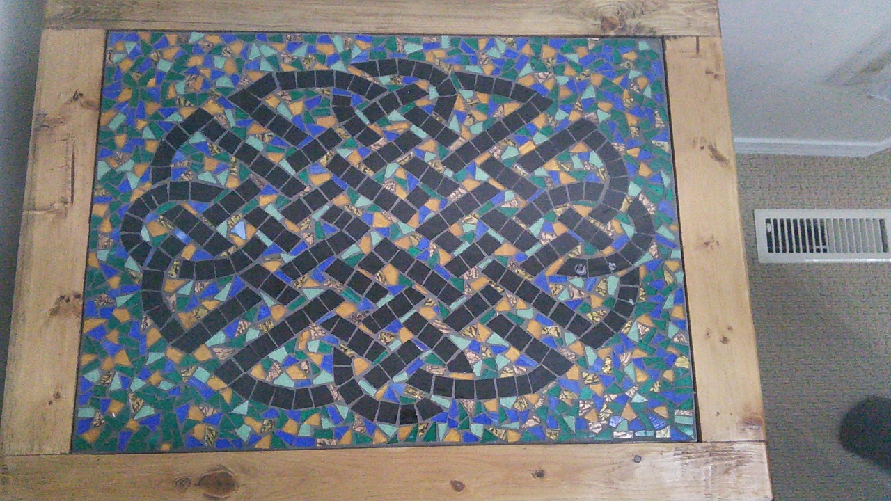 I stained the whole thing with two coats of watco medium walnut danish oil then two coats of brush on polyurethane. once it was totally dry I put the mosaic back in place and it was finished!