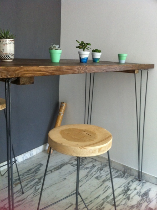 When my daughter first settled with her boy friend in their first empty appartment, I was happy to be able to contribute with home made furnitures like this table and stools. I already made a coffee table with pallets and hairpin legs and a desk also with hairpin legs. Here are the posts in my blog.