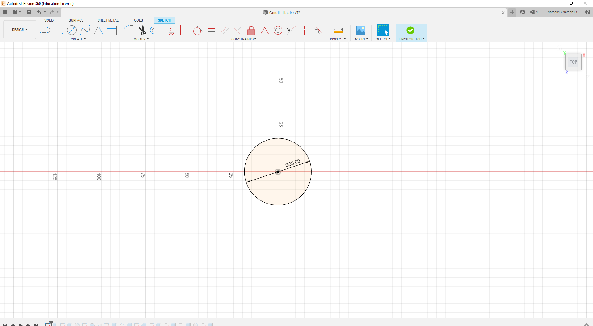 Create a new sketch on the top of the candle body. Create a small circle around 7 mm in diameter.