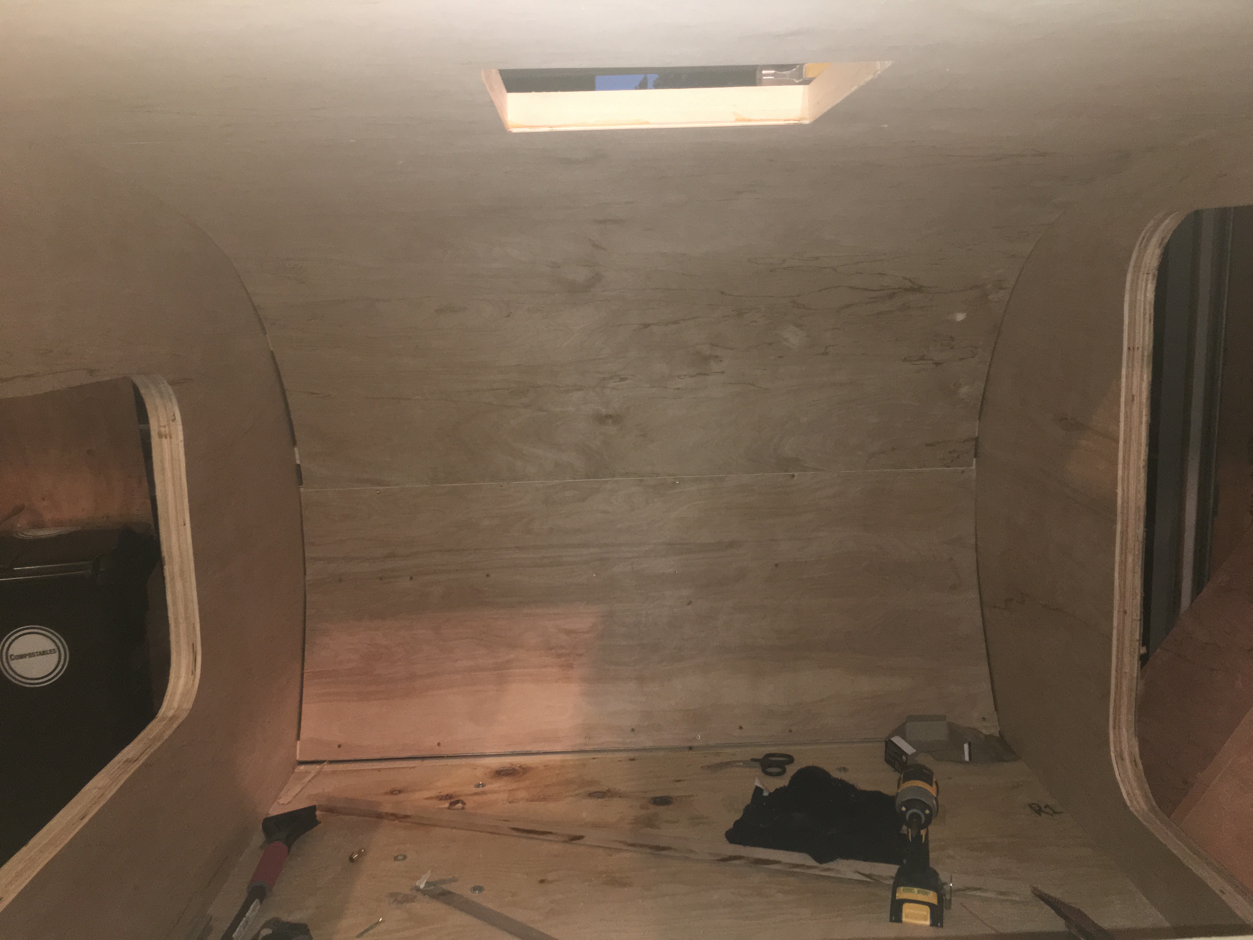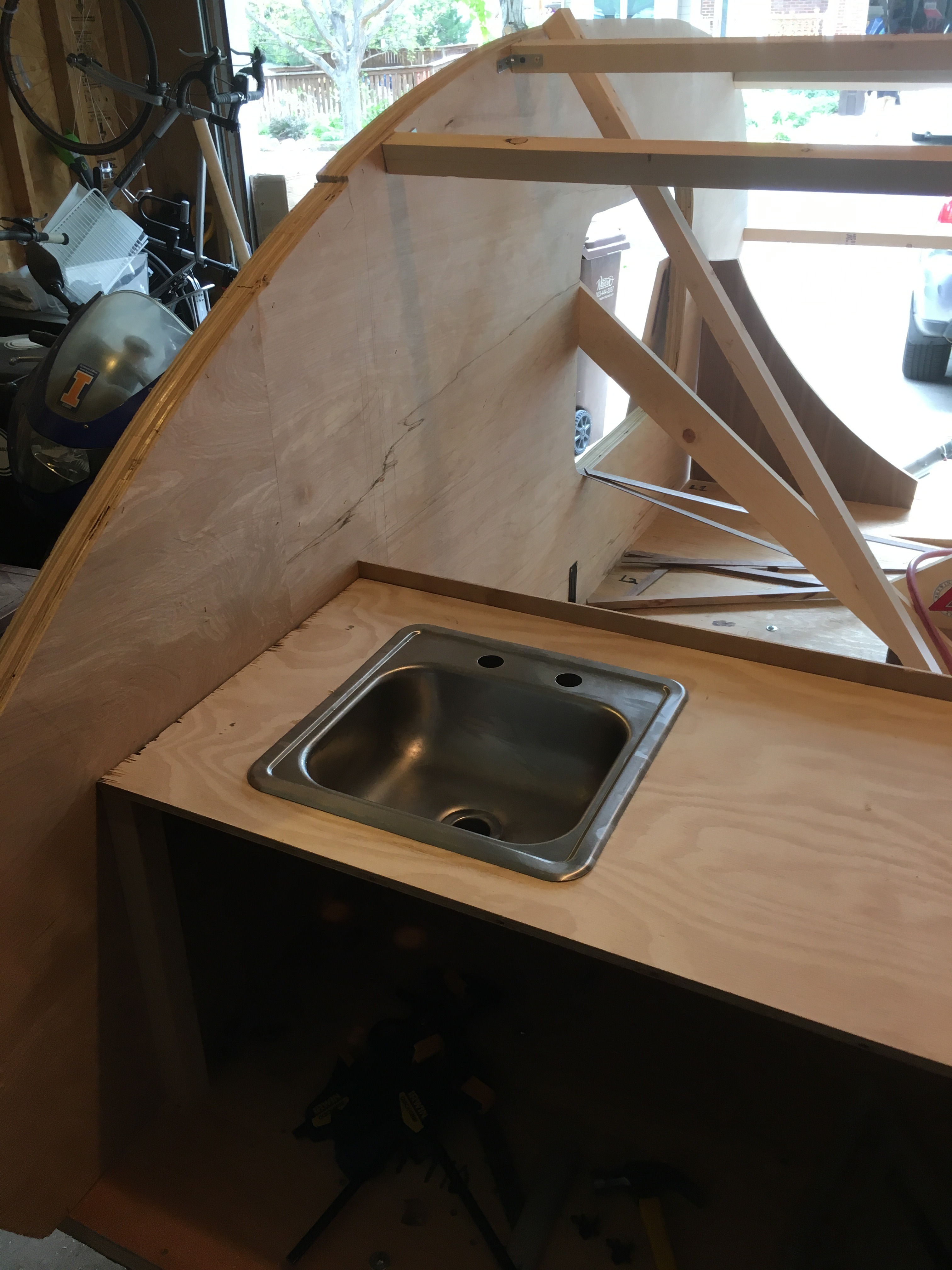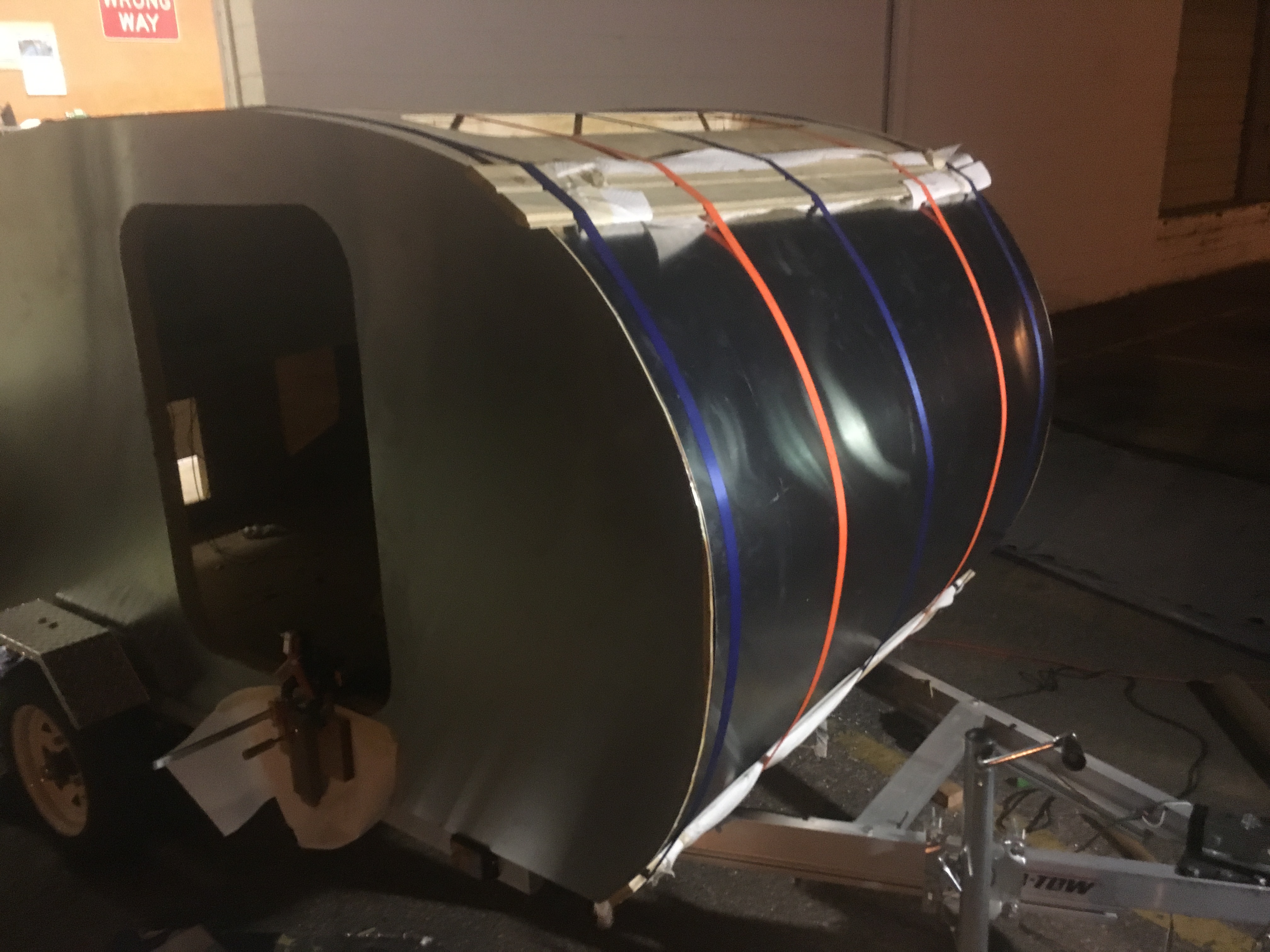 Lastly, you want to add the outer shell layer to the roof. This isn't nearly as hard as the interior roof shell because you have gravity and an already very rigid frame working in your favor. One thing you can do is take straps to pressure the plywood to conform to the shape of the teardrop. Again, if the wood isn't bending perfectly, you can moisten it with some water (pictured).